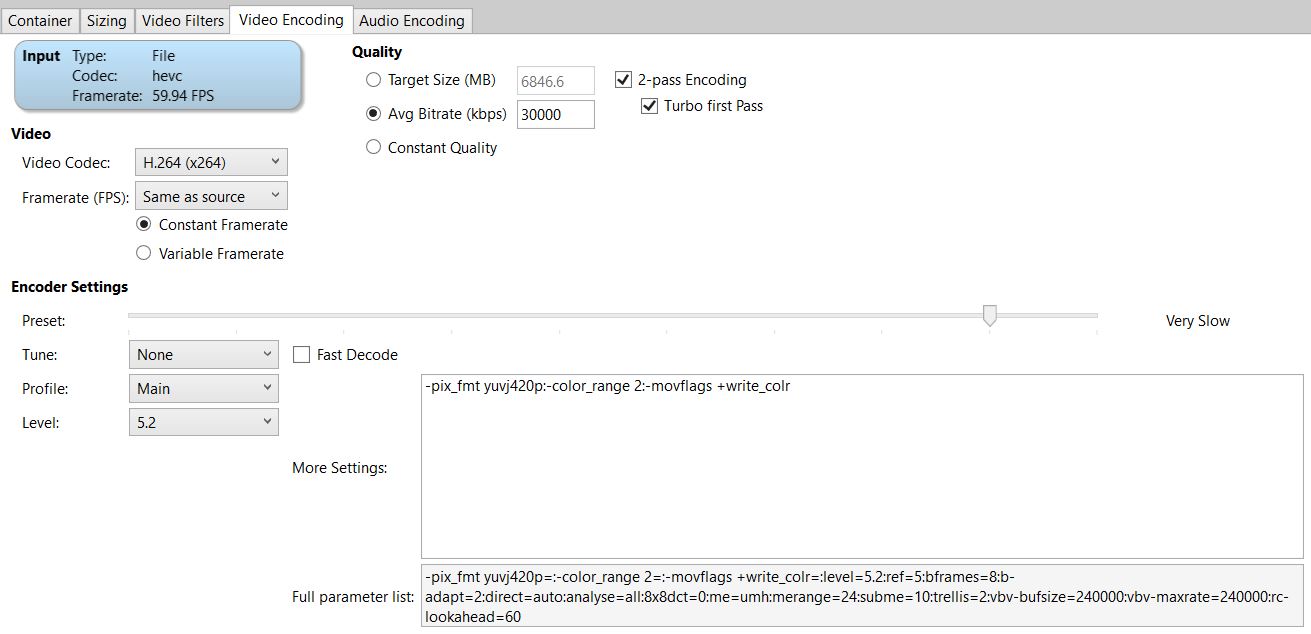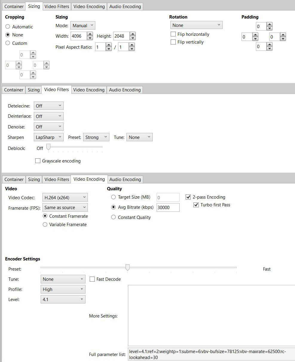 I am resizing some mp4 files from 5400x2700 to 4096x2048. I also need to add sharpness. Look at the settings here below. The problem is that the resulting file loose contrast/saturation. Why ??? What can I do ? For "TUNE" I use NONE, also tried FILM, but the result is the same.