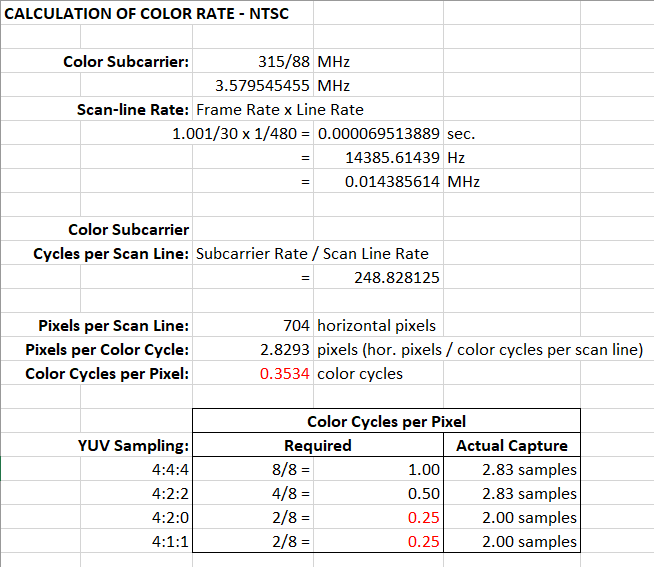 I'm now wondering if my calculation is proper for NTSC... should I use bandwidth instead of subcarrier frequency? If yes, that would really bring the numbers down. Maybe bandwidth relates to color bit depth and subcarrier frequency relates to sampling interval?