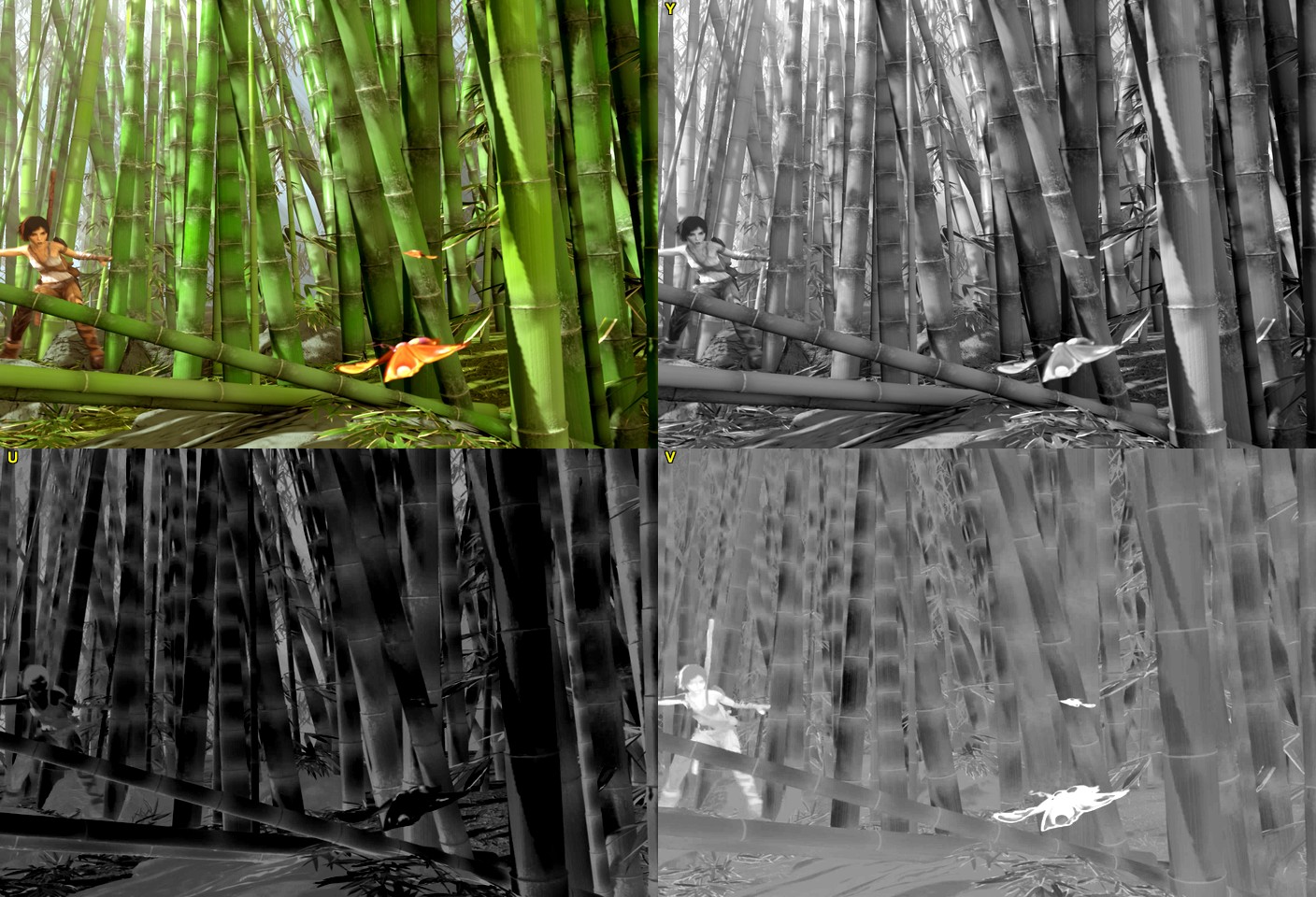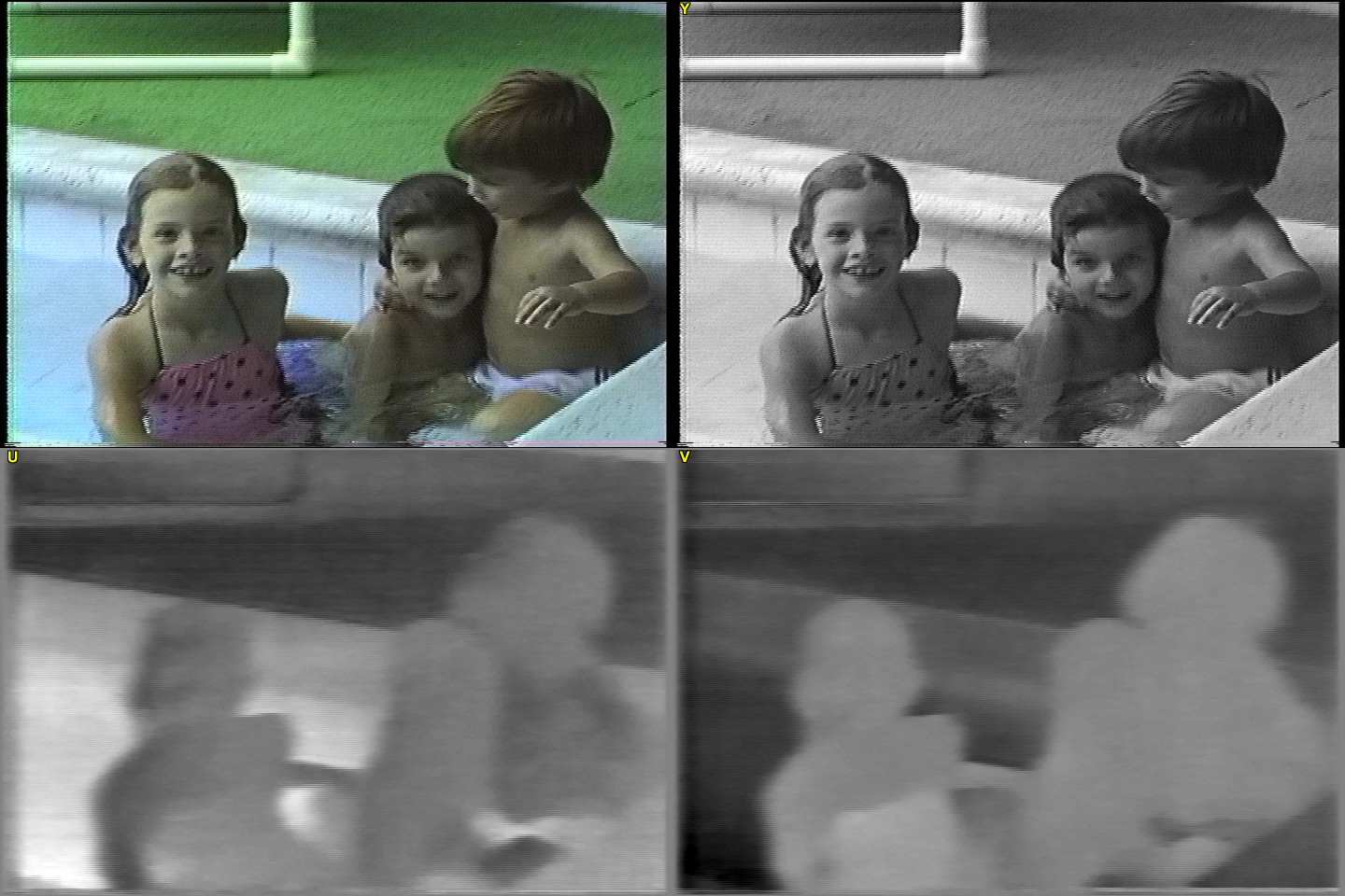 Note that saturation was increased for the U and V plots in order to have more contrast in the images.Code:ImageSource("frame.jpg") ConvertToYV24() StackVertical(StackHorizontal(last, GreyScale().SubTitle("Y")), StackHorizontal(Tweak(sat=3.0).UtoY().Subtitle("U"), Tweak(sat=3.0).VtoY().Subtitle("V")))
