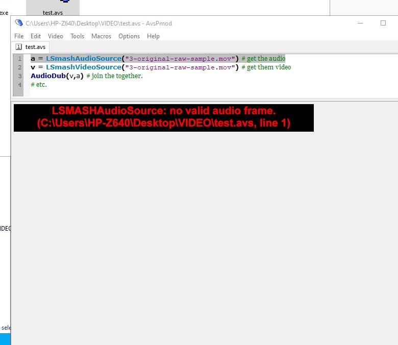 Code:a = LSmashAudioSource("3.mov") # get the audio v = LSmashVideoSource("3.mov") # get them video AudioDub(v,a) # join the together. # etc. -