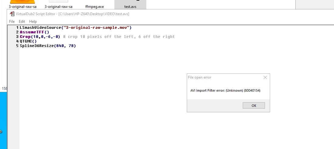 Since your source was a mov file I used LSmashVideoSource() to open it (AviSource() is only for AVI files). You'll need to install the LSMASHSource filter for AviSynth:Code:LSmashVideoSource("3.mov") AssumeTFF() Crop(10,0,-6,-0) # crop 10 pixels off the left, 6 off the right QTGMC()