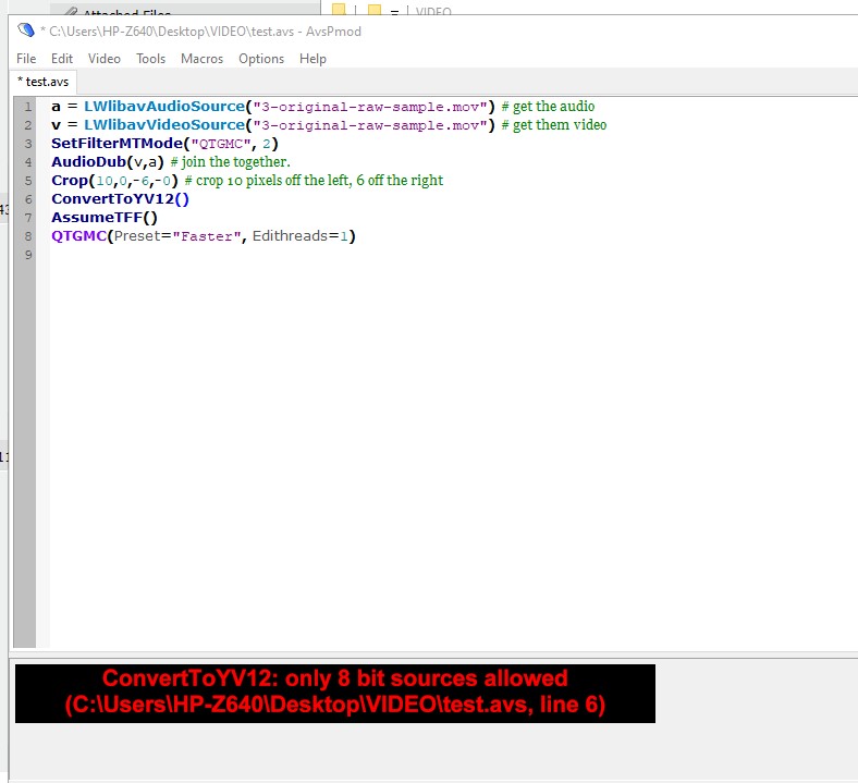 Code:a = LWlibavAudioSource("3-original-raw-sample.mov") # get the audio v = LWlibavVideoSource("3-original-raw-sample.mov") # get them video SetFilterMTMode("QTGMC", 2) AudioDub(v,a) # join the together. Crop(10,0,-6,-0) # crop 10 pixels off the left, 6 off the right #ConvertToYV12() AssumeTFF() QTGMC(Preset="Faster", Edithreads=1)