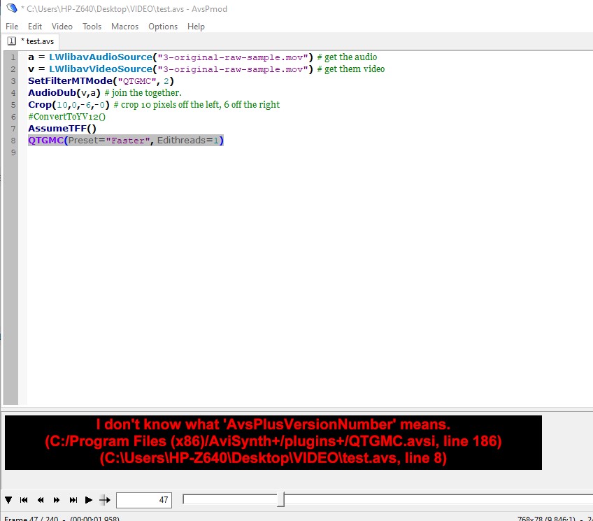 Code:a = LWlibavAudioSource("3-original-raw-sample.mov") # get the audio v = LWlibavVideoSource("3-original-raw-sample.mov") # get them video AudioDub(v,a) # join the together. SetFilterMTMode("QTGMC", 2) Crop(10,0,-6,-0) # crop 10 pixels off the left, 6 off the right #ConvertToYV12(interlaced=true) AssumeTFF() QTGMC(Preset="Faster", Edithreads=1) #a = LWlibavAudioSource("3-original-raw-sample.mov") # get the audio #v = LWlibavVideoSource("3-original-raw-sample.mov") # get them video #AudioDub(v,a) # join them together. #Version()