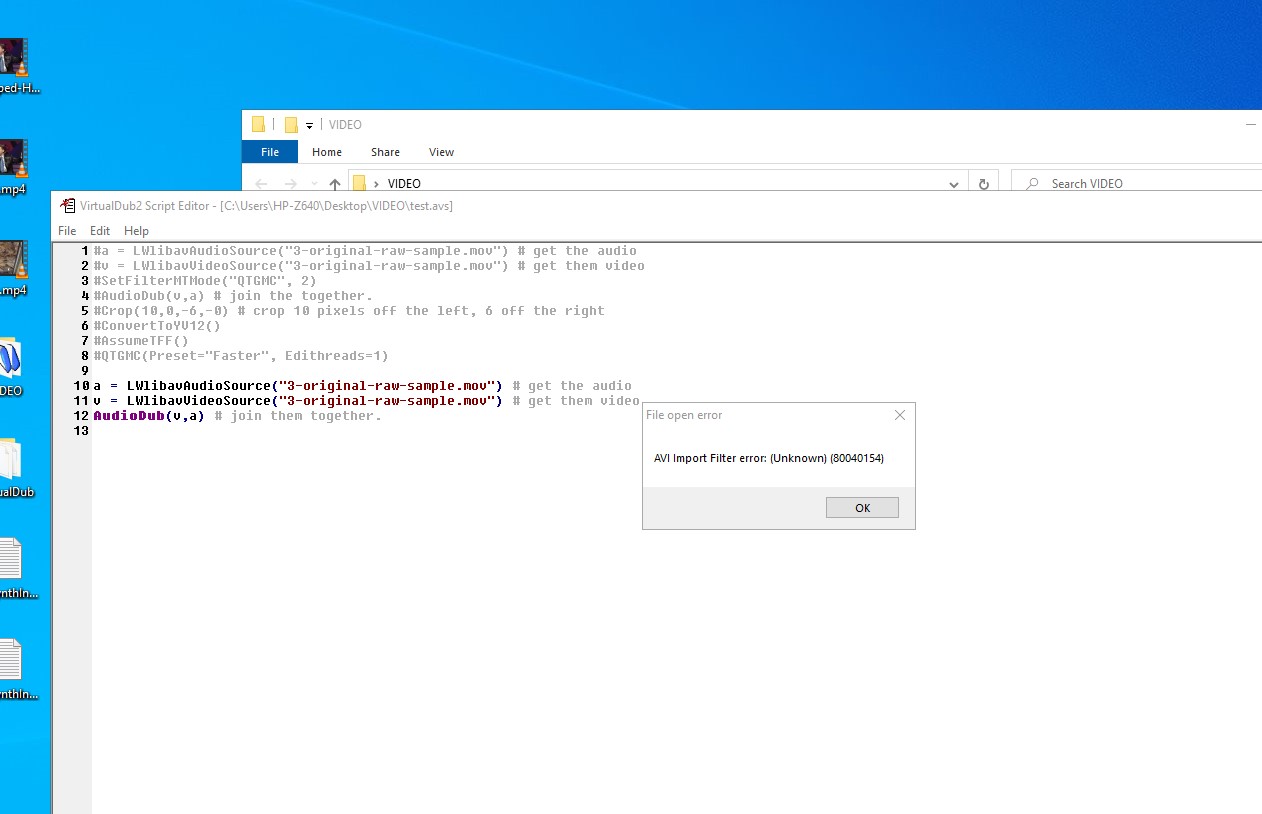 Open that in VirtualDub2. Verify you have video and sound.Code:a = LWlibavAudioSource("3-original-raw-sample.mov") # get the audio v = LWlibavVideoSource("3-original-raw-sample.mov") # get them video AudioDub(v,a) # join them together. -