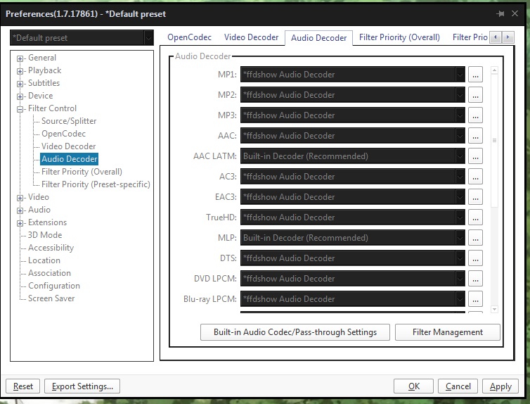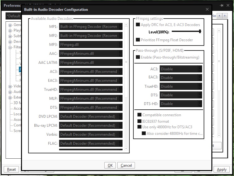 ffdshow is selected from every allowable drop down audio decoder selection box in potplayer settings