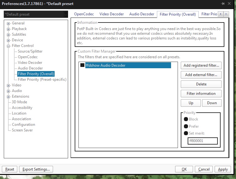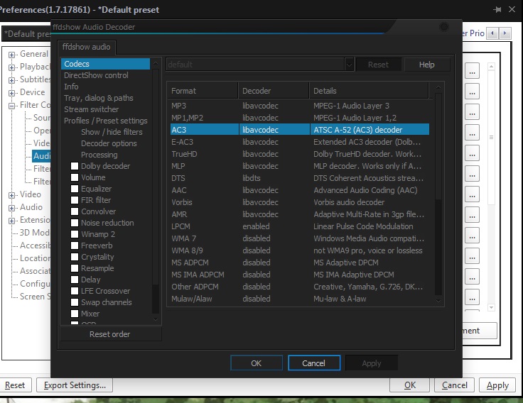 However, for some reason no player will use any filter not ffdshow, not lav and not ac3 ( mpc-be) is another weird story as it has its own built in version of lav.