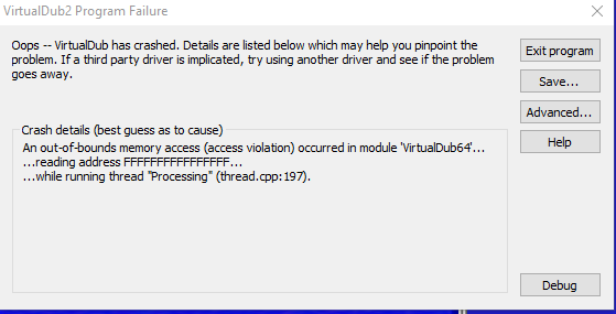 AVS script compression failure in VirtualDub2 / Lagarith RGB