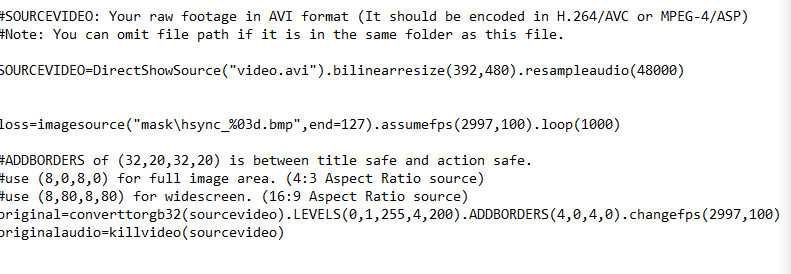 original=converttorgb32(sourcevideo).LEVELS(0,1,25 5,4,200).ADDBORDERS(4,0,4,0).changefps(2997,100)