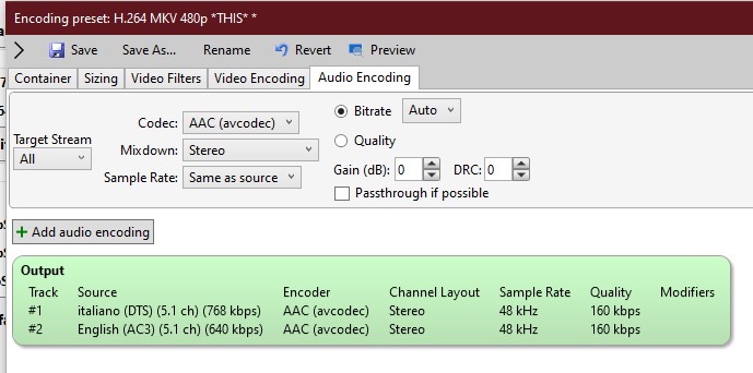 In this case source is dts/ac3 5.1 channels. Is it a good idea to convert in aac (mixdown stereo)? If yes, I don't know what to choose: bitrate or quality? I tried with auto bitrate and the result is a 50 MB audio (video has a length of 43 mins). Choosing default (5) quality instead, result is 120 MB. I think 120 MB is too much, considerating that video track is 235 MB. -
