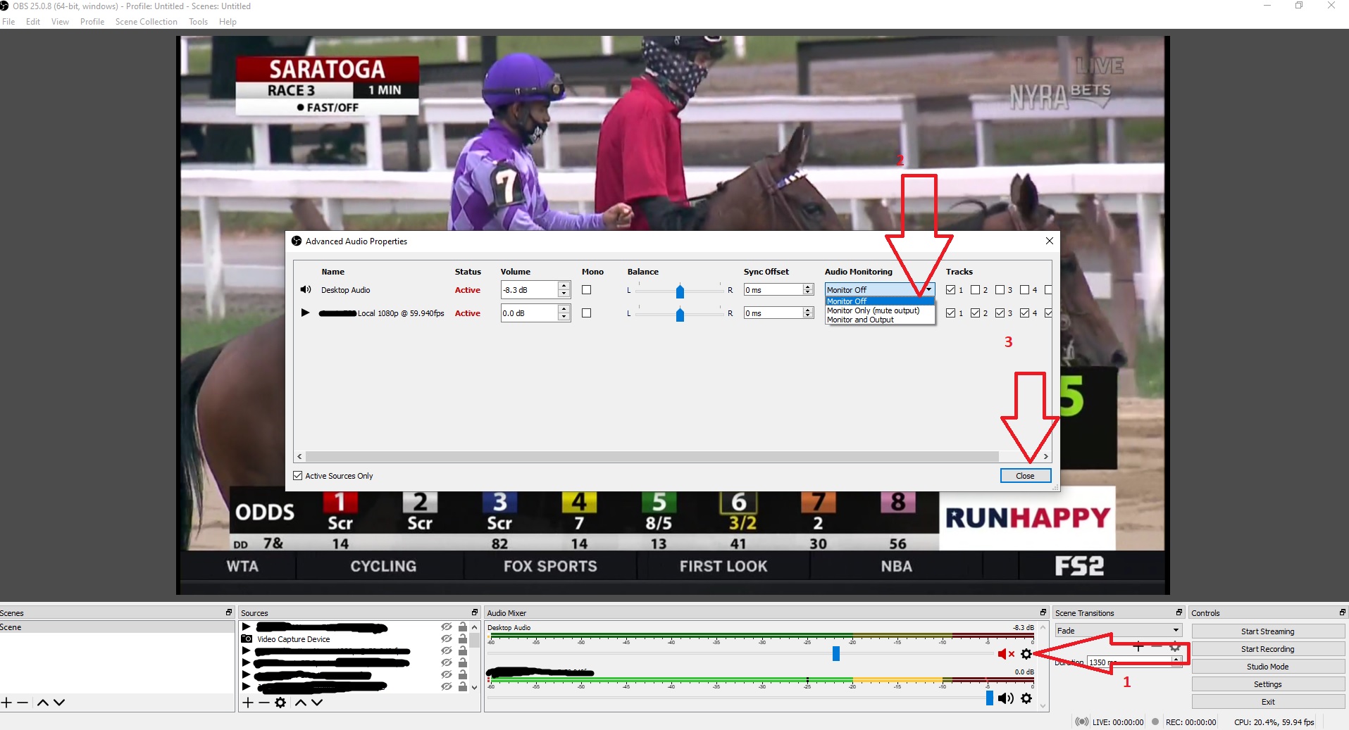 Then go back to Audio Mixer > Click Gear icon > Advanced Audio properties > Select what you want (I select Audio and Monitor so i can record and listen on headphones too)