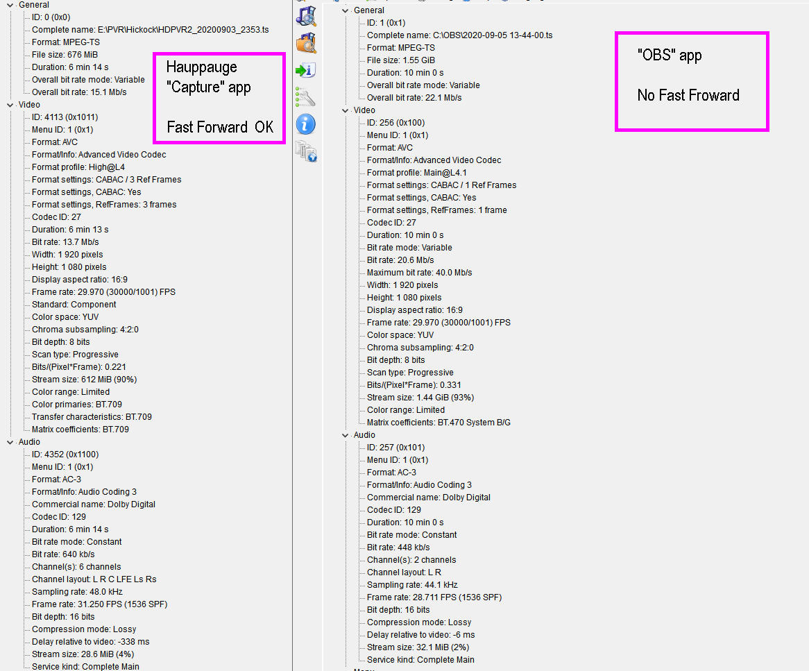 OK to make this project a "complete" success. I can not Fast Forward the burned Blu-Ray disc with OBS captured video in a set top BD player(s). I can skip chapters ok. The Hauppauge Capture app captured video burned Blu-Ray disc can Fast Forward. I use tsMuxer on both captured videos to generate the needed BD components to burn the BD disc, and I use ImgBurn to burn the BD discs.