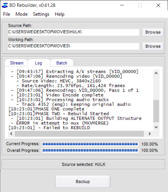 I had a 4K movie in HEVC mkv but my laptop was stuttering even when trying to play the file but i am sure it's just a weak configuration. I did however run tbe process through BDRebudiler and did get a proper folder but I couldn't not check it because again, weak configuration.
