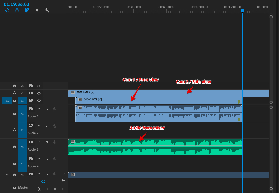 The two video files are from different angles. So a project with multi cam. Audio was recorded by the mixer and must then be synchronized with the two videos (multi cam).