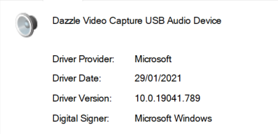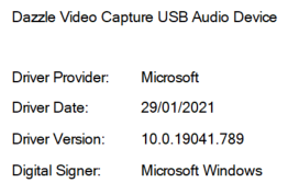 My Dazzle worked perfectly before i had to reset my PC i had an older Windows USBAUDIO driver installed which was dated 2020 as mentioned in my earlier posts in this thread. I tried a new capture card to see if that worked and that had the same issue Windows would just install the same AUDIO driver. Not sure where i go from here. -