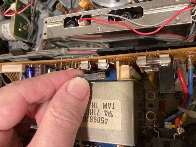 The second it turned out the linear power supply had a blown fuse, one of those glass cartridge types. It has like six glass fuses spaced all around its huge power transformer. I swapped the good fuse from same position in the the working vcr for test and it powered right up.. very bright display. When I loaded a tape however it seemed to spool properly and wrap around the drum, but in drive mode it started screeching.. that lasted maybe half a second and the arms retracted and unloaded then ejected the tape.