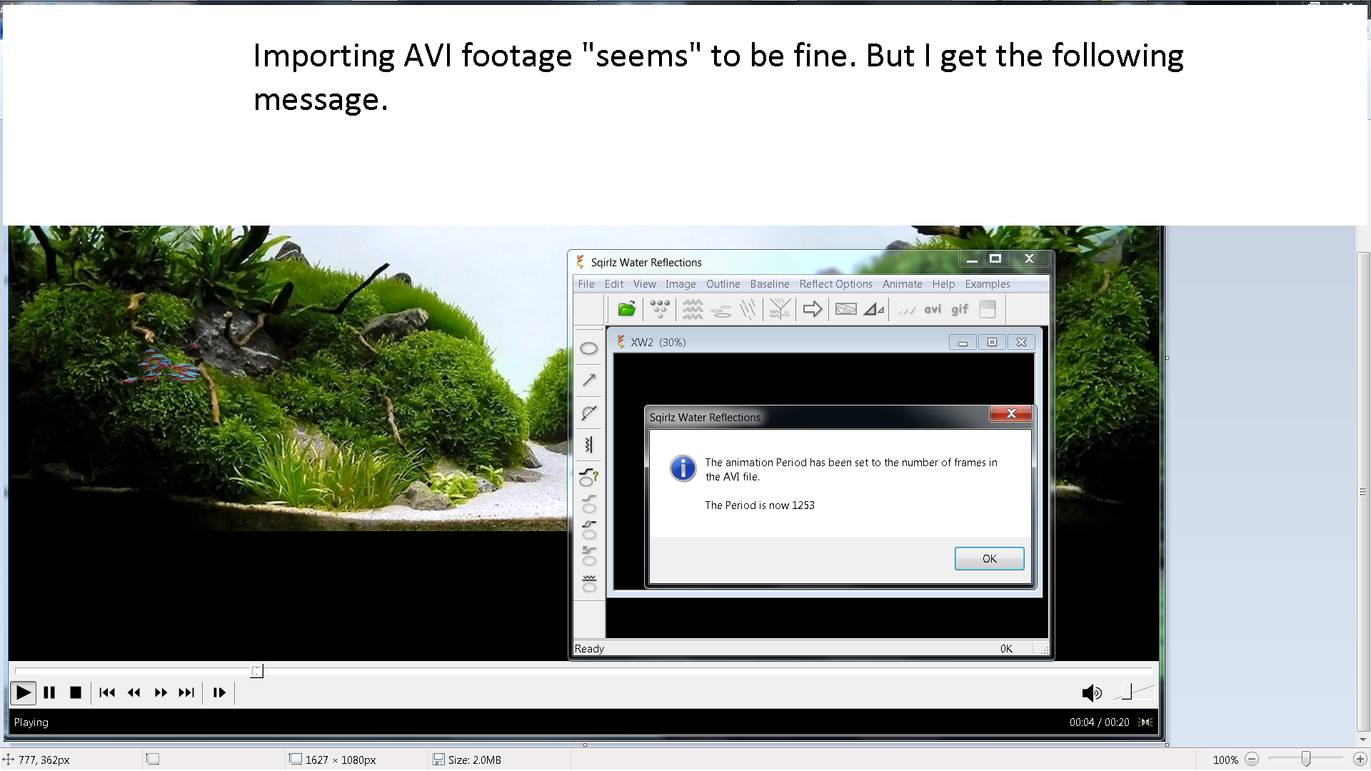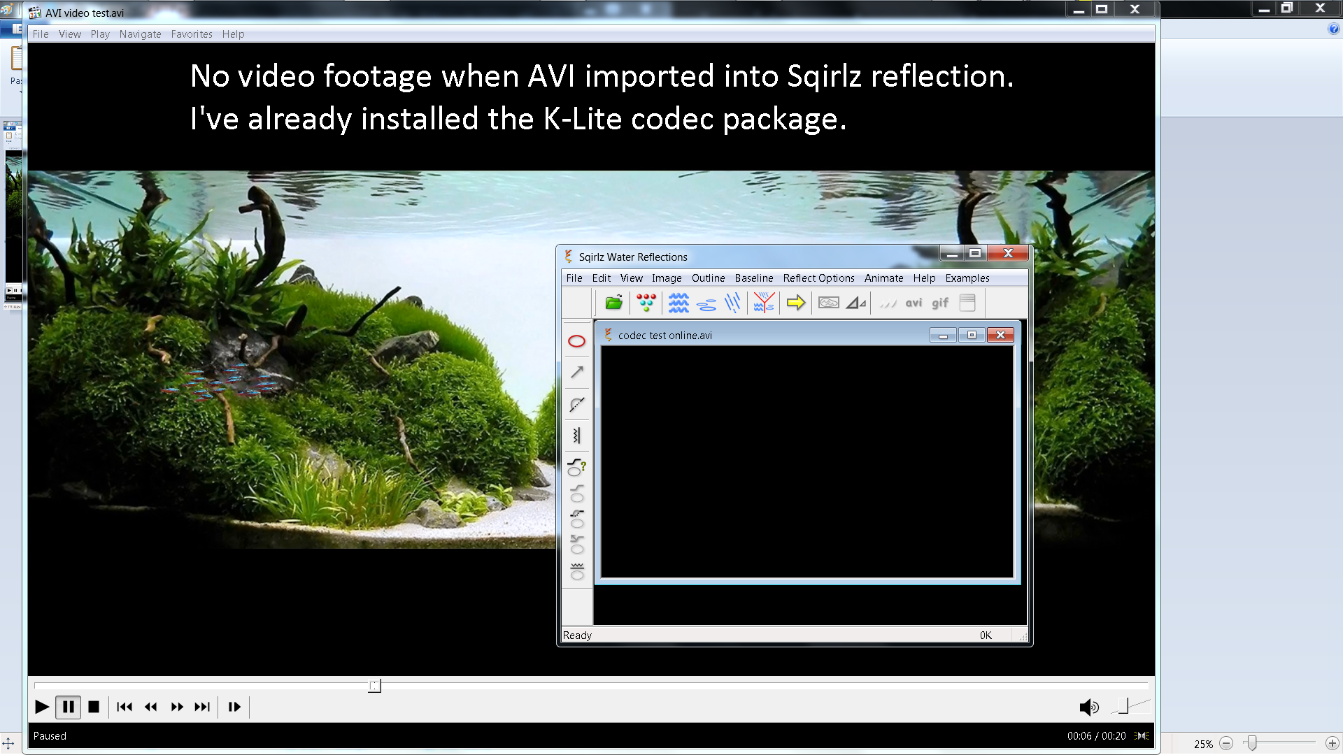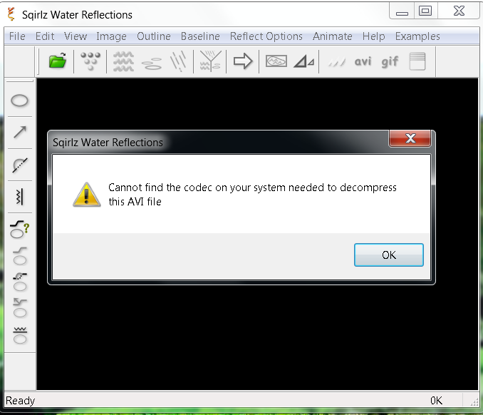 This post (or eventual thread) concerns the free software Sqirlz Water Reflection 2.6. It's a little program that adds water reflection or ripple animations to images or videos. I can get images to work, but not videos -- a codec likely is missing. I don't know if this fits in any subforum. But I believe the problem has something to do with codecs.