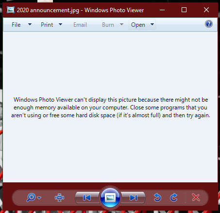 I`m working with images (making icons for IT startups) and sometimes I have a problem with opening an image.When I`m opening any image I have an error "Windows photo viewer can't run because of not enough memory?".