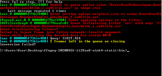 ffmpeg -i C:\Users\User\Videos\Japan_Hour\Its_Lunchtime_1_temp.mp4 -vf ass="C:\Users\User\Videos\Japan_Hour\working\Its_Lunchtime_1_subtitle.ass" C:\Users\User\Videos\Japan_Hour\Its_Lunchtime_1.mp4