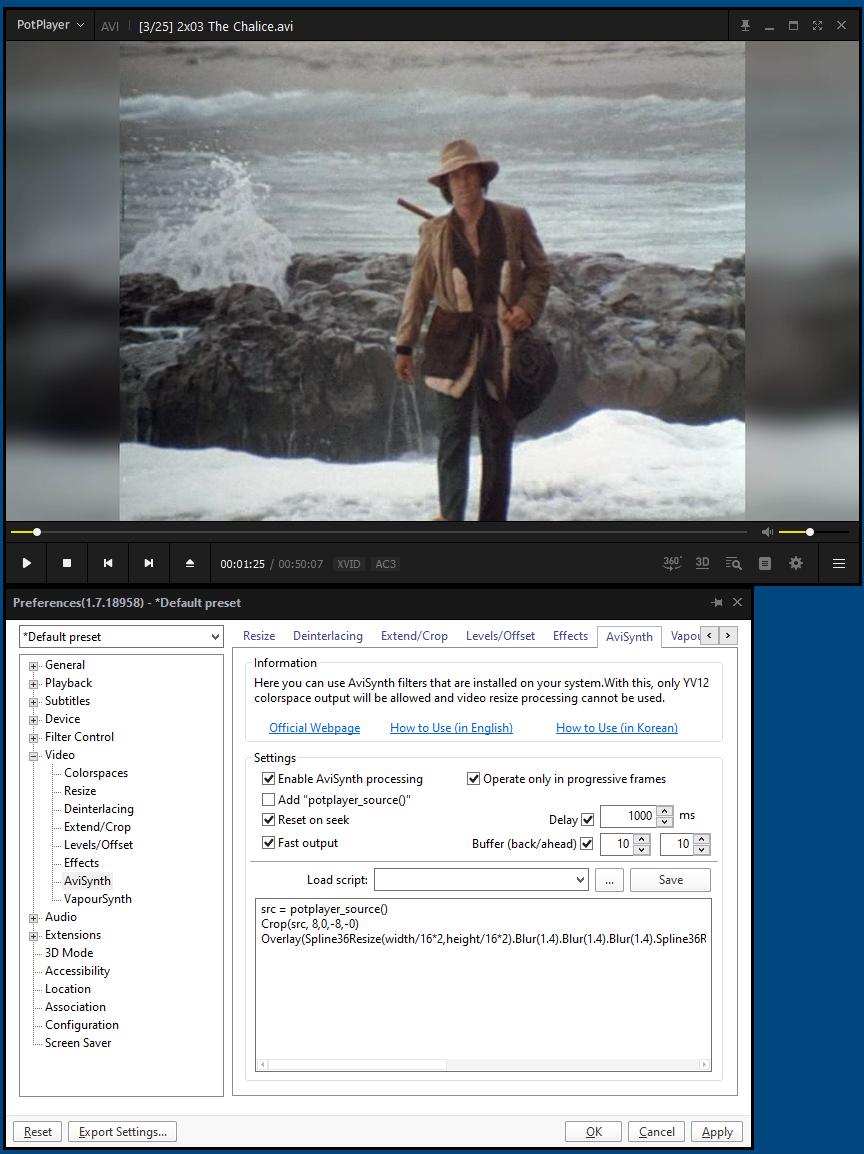 No, I used my own. It was a little tricky because PotPlayer doesn't allow (as far as I could tell) the script to enlarge the frame. So I had to keep the original 720x480 frame (4:3 DAR) of the AVI source. To get it to display as 16:9 I had to force the DAR in the player.