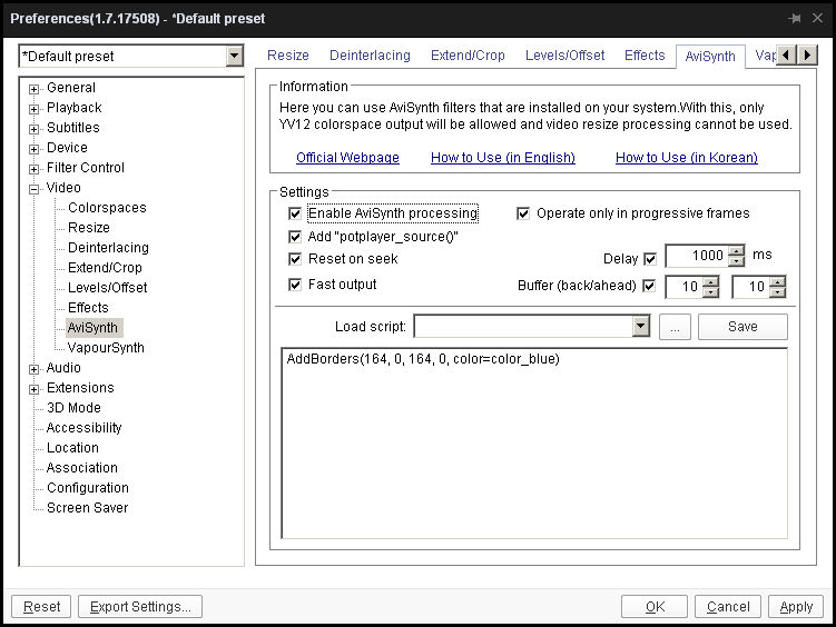 Note that this script is running within PotPlayer. It's not an external script. That allows the script to be applied to whatever video PotPlayer is playing. Hence, the problem isn't that AviSynth can't change the frame size, it's that PotPlayer still uses the frame size of the video it's playing. If you enlarge the frame from 720x480 to 856x480 in AviSynth Potplayer will only use the left 720x480 and you will lose the right edge of the picture.
