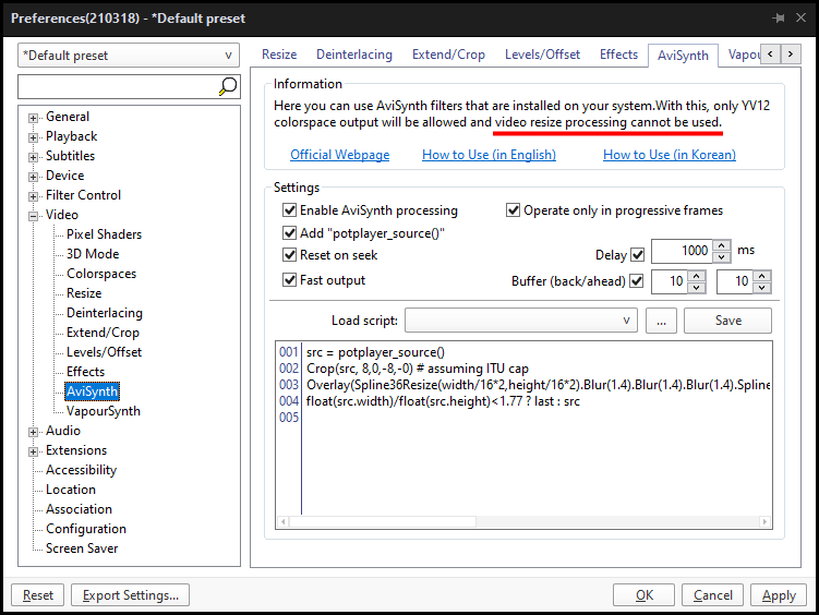 "Here you can use avisynth filters that are installed on your system. With this, only YV12 colorspace output will be allowed and video resize processing cannot be used."