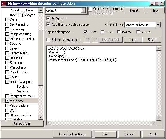 and I putin FFDSHOW raw video decoder.Code:CR15(InDAR=15.0/11.0) W = width() H = height() FrostyBorders(floor(H * 16.0 / 9.0 / 4.0) * 4, H)