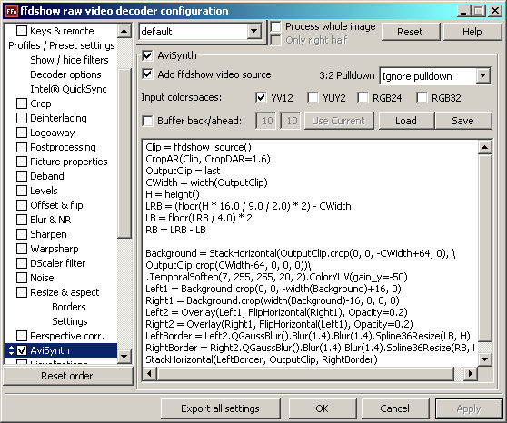 Code:function QGaussBlur(clip v) { return v\ .BilinearResize(max(16, floor(float(width(v)) / 100.0 / 2.0) *2), max(16, floor(float(height(v)) / 100.0 / 2.0) * 2))\ .GaussResize(v.width, v.height, p=19) }Code:Clip = ffdshow_source() CropAR(Clip, CropDAR=1.6) OutputClip = last CWidth = width(OutputClip) H = height() LRB = (floor(H * 16.0 / 9.0 / 2.0) * 2) - CWidth LB = floor(LRB / 4.0) * 2 RB = LRB - LB Background = StackHorizontal(OutputClip.crop(0, 0, -CWidth+64, 0), \ OutputClip.crop(CWidth-64, 0, 0, 0))\ .TemporalSoften(7, 255, 255, 20, 2).ColorYUV(gain_y=-50) Left1 = Background.crop(0, 0, -width(Background)+16, 0) Right1 = Background.crop(width(Background)-16, 0, 0, 0) Left2 = Overlay(Left1, FlipHorizontal(Right1), Opacity=0.2) Right2 = Overlay(Right1, FlipHorizontal(Left1), Opacity=0.2) LeftBorder = Left2.QGaussBlur().Blur(1.4).Blur(1.4).Spline36Resize(LB, H) RightBorder = Right2.QGaussBlur().Blur(1.4).Blur(1.4).Spline36Resize(RB, H) StackHorizontal(LeftBorder, OutputClip, RightBorder)