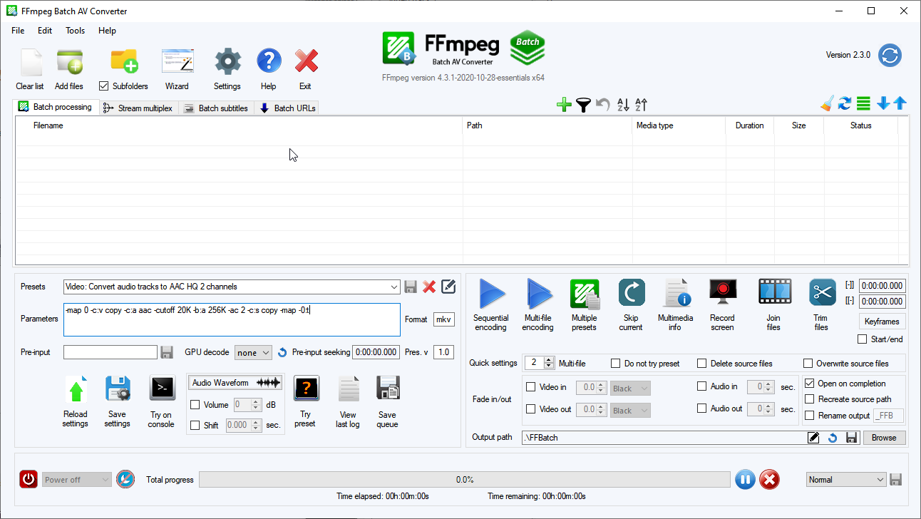 (remove the 2 spaces between : and s)ffmpeg -i "inputvideo.mkv" -map 0:v:0 -map 0:a:0 -map 0:a:1 -map 0: s:0 -c:v copy -c:a aac -cutoff 20K -b:a 256K -ac 2 -c: s copy "outputvideo.mkv"