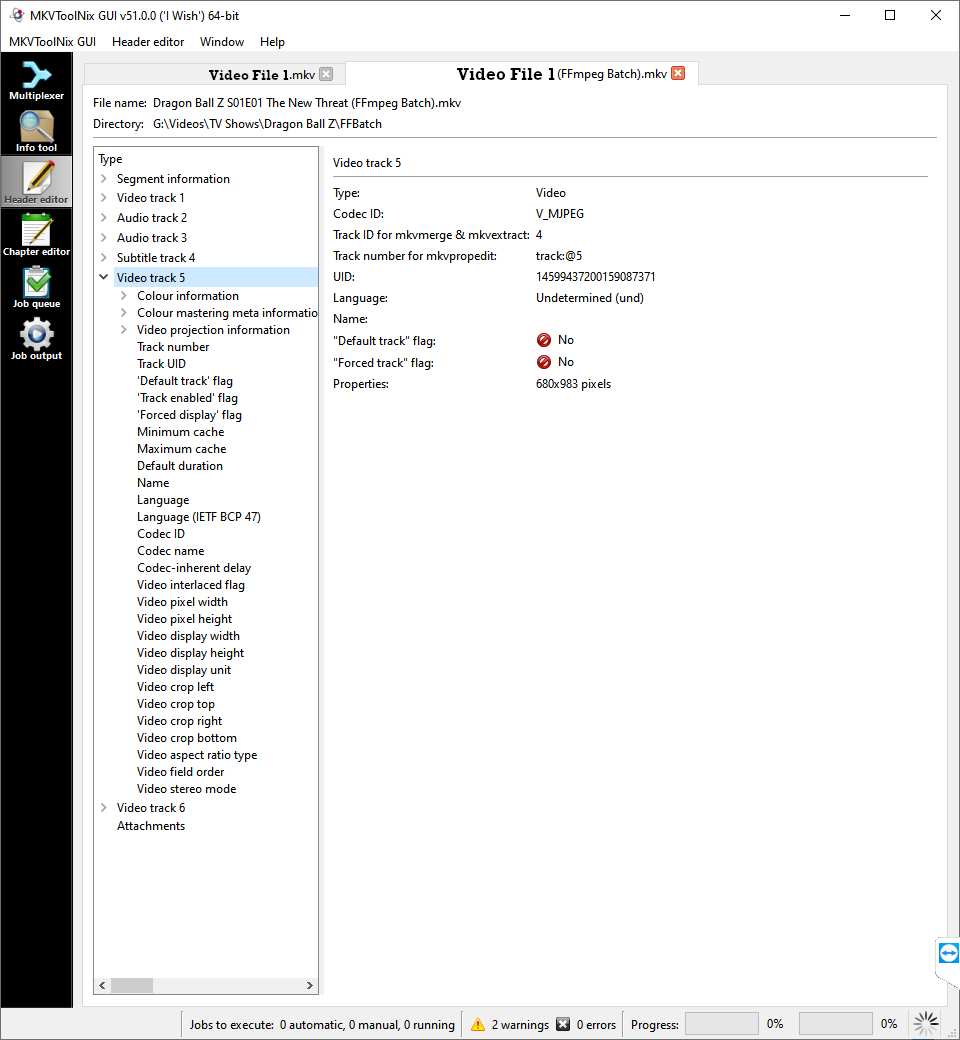 The images below show the header information in the files. The first image shows the initial file and the tracks involved, as well as some "zoomed in" information for the segment information and the attachments. The second image shows the second file created after the conversion and is "zoomed in" on the first video track, which has the dimensions for the first cover art image, and the third and final image shows the second file again, showing the dimensions of the second erroneously created video track which has the second cover art image's dimensions.