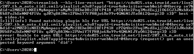 streamlink --hls-live-restart "https://cdn025.stm.trueid.net/live2/207_th_m_auto_tidl.smil/playlist.m3u8?appid=true4u&visitor=web&uid=04brcrp se7&did=a2M0ZDlsNXE1Mg&mpass=aMgM%2BEheD8%2BftP4lH zPZQ4b%2Fnq3MsdEujjIO6SCJ3JNxhKxRVk8PxJhEeNNF4PIWx qJ07q8A3Ne%2FWm1Y7fPH0jo6Ro99v4GN6NIJYaOA12Qxeg%3D %3D" best -o video.ts