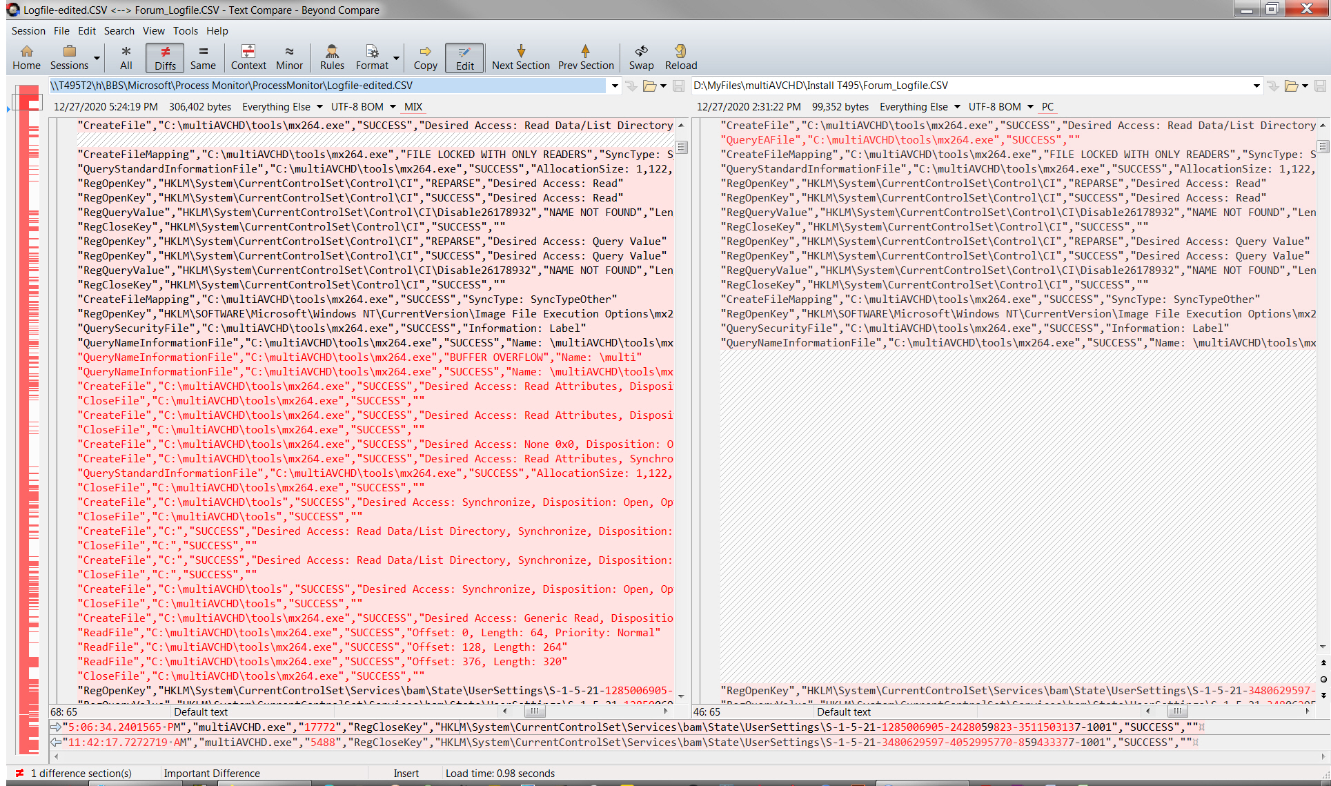 However I still think the fundamental problem is revealed much earlier in the trace. As you can see from the following comparison, even though your mysterious QueryEAFile for multiAVCHD.DAT has disappeared, there now is one of them for MX264.EXE. I'm not a programmer at this level, but I'm guessing this is referring to a "program information file" for MX264.EXE, and if not found it gets created. Or something. But whatever is going on, your trace and my trace is different. Perhaps since I've run multiAVCHD multiple times that program information file for MX264.EXE is already created on subsequent requests. For you, the very first time you run your test after installing Win10 there isn't yet an entry for it. Perhaps that's the difference here.