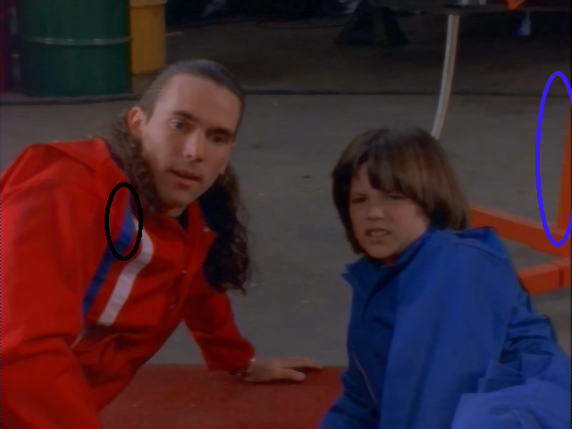 The electrical lines video was slowed after being telecined. Something like works pretty well for the center and right of the frame, not so well on the left:Code:src = Mpeg2Source("rainbow.demuxed.d2v") drb = mfRainbow(src, interlaced=true).TFM().TDecimate() TFM(src) TDecimate() lmask = mt_edge(mode="0 -8 0 -8 32 -8 0 -8 0", thy1=5, thy2=5).mt_expand().mt_inpand().mt_inpand().Blur(1.0).GreyScale() Overlay(last, drb, mask=lmask)