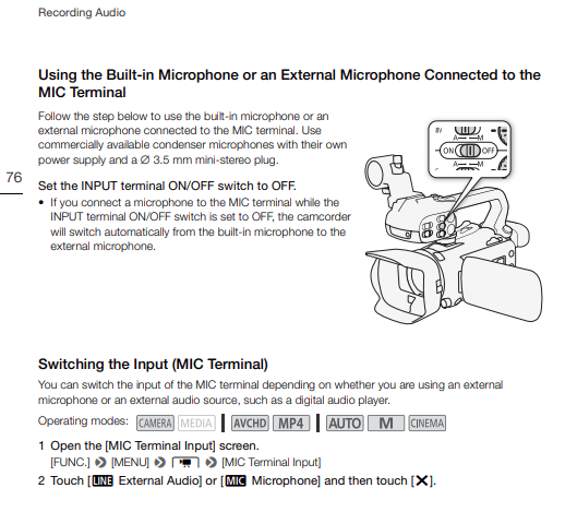 But a tech at our local camera store tried out a powered external mic (an Azden, I believe) on the XA-11--and that didn't work, either.