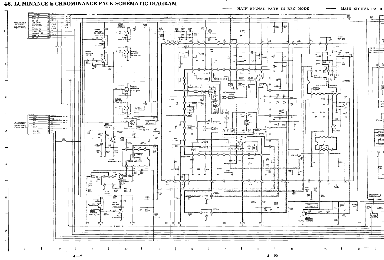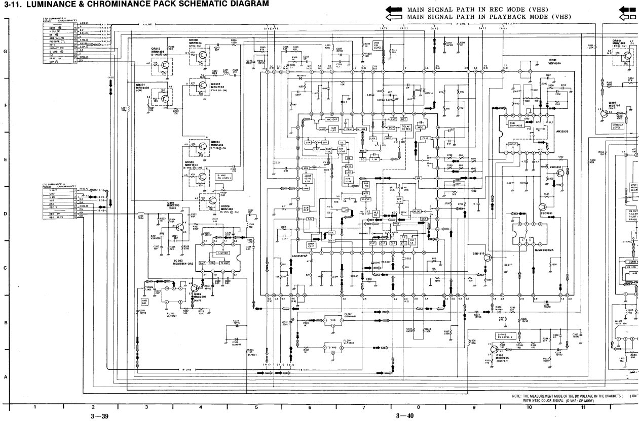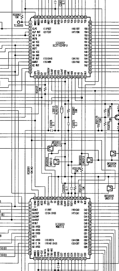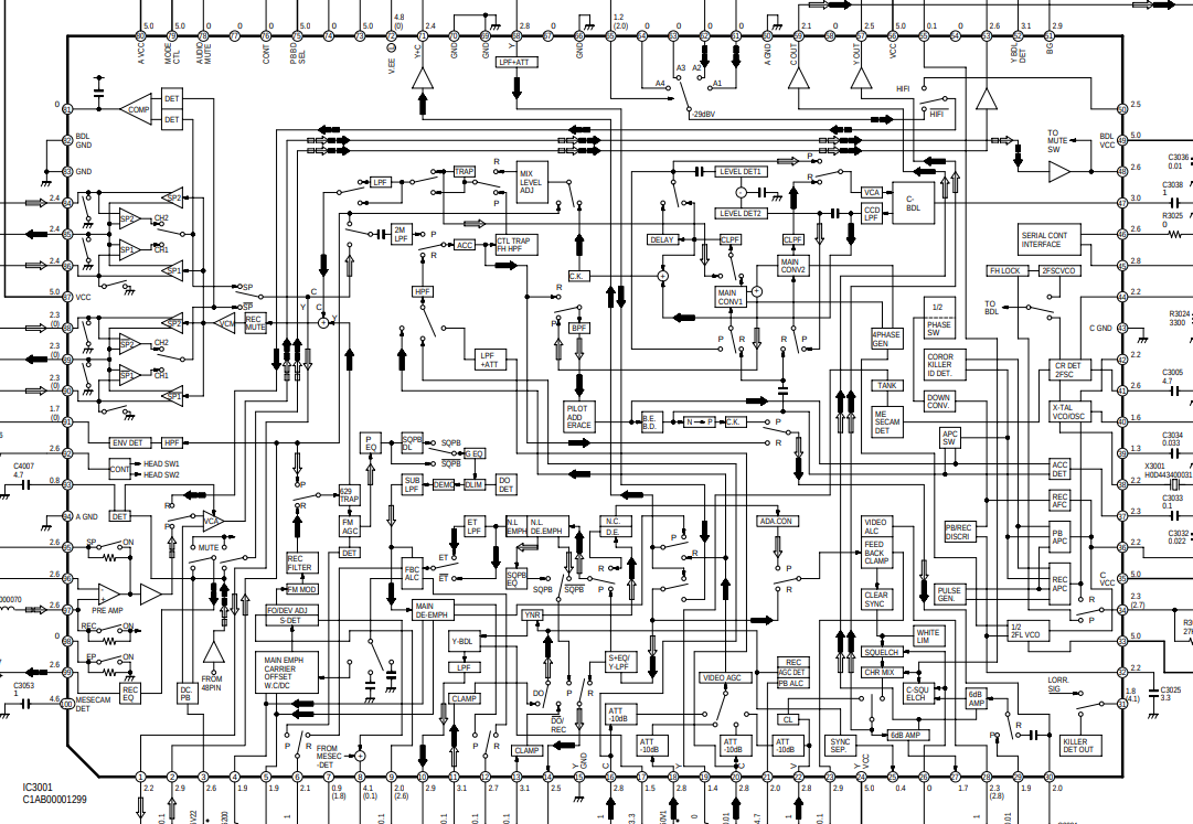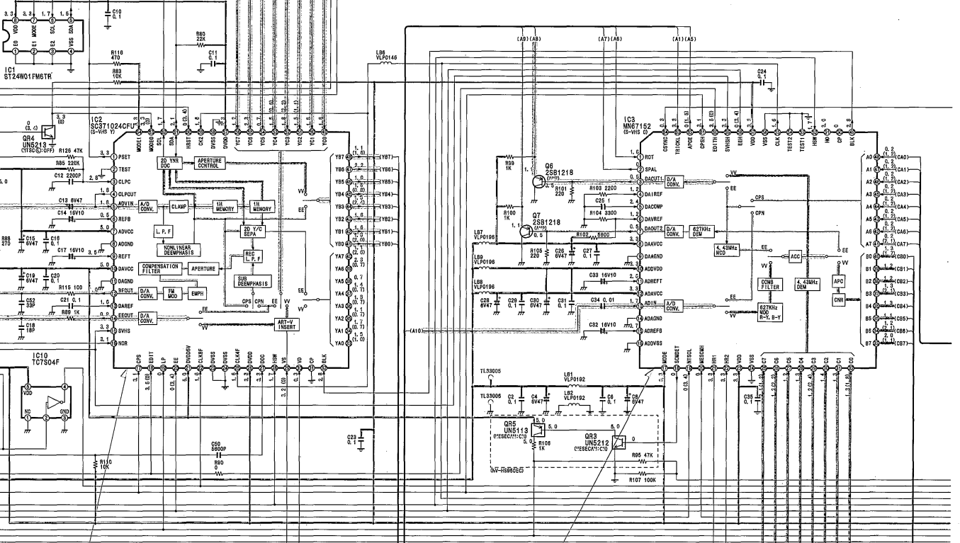 The later 830, 880, 930 and non-TBC 820, 825 and 870 seems to have moved back to a more traditional setup, with a video IC that looks suspiciosly similar to one JVC used in their later models (just noted with a part number in the schematics, but the pinout seem to be the same), and some off-the-shelf TBC/DNR/YC sep chips from Toshiba (TC90A88F, TC90A79AF TC90A11F).
