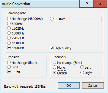 But capturing 8-bit audio is a huge compromise. I highly recommend you figure out how to get 16 bit audio capture working properly. For video you should usually be capturing 16 bit, 48000 Hz, stereo (2-channel). -