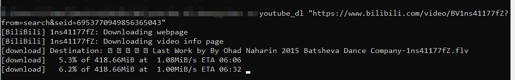 Code:C:\Youtube-dl>youtube-dl https://www.bilibili.com/video/BV1ns41177fZ [BiliBili] 1ns41177fZ: Downloading webpage [BiliBili] 1ns41177fZ: Downloading video info page [download] Destination: 【现代舞】Last Work by By Ohad Naharin 2015 Batsheva Dance Company-1ns41177fZ.flv [download] 3.8% of 418.66MiB at 1.67MiB/s ETA 04:00