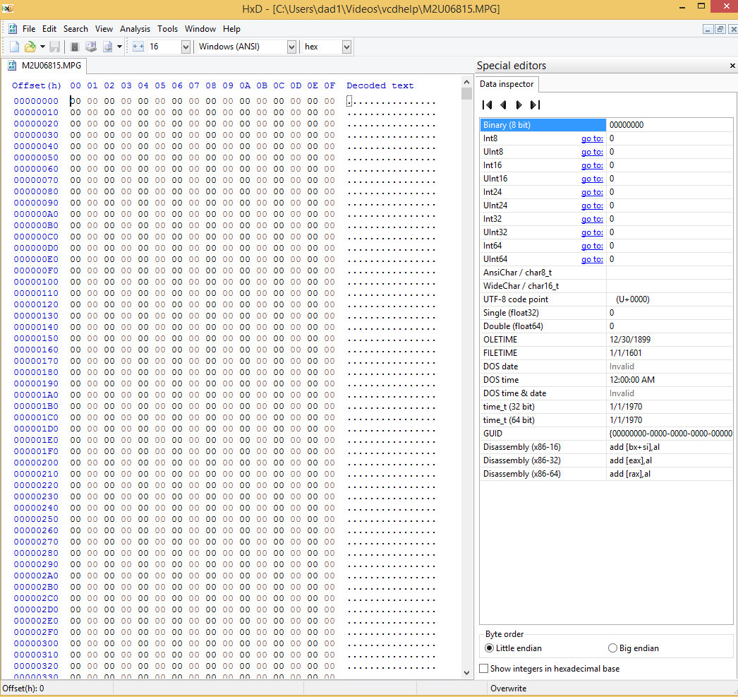 These are the copies of the original files that were on the DVD. As I stated in my previous comment I also tried the Hex Editor on the original files directly on the DVD itself. They also have only zeros in them. So it might be that the burning software didn't do a good job and only allocated the files in size, but not in data.