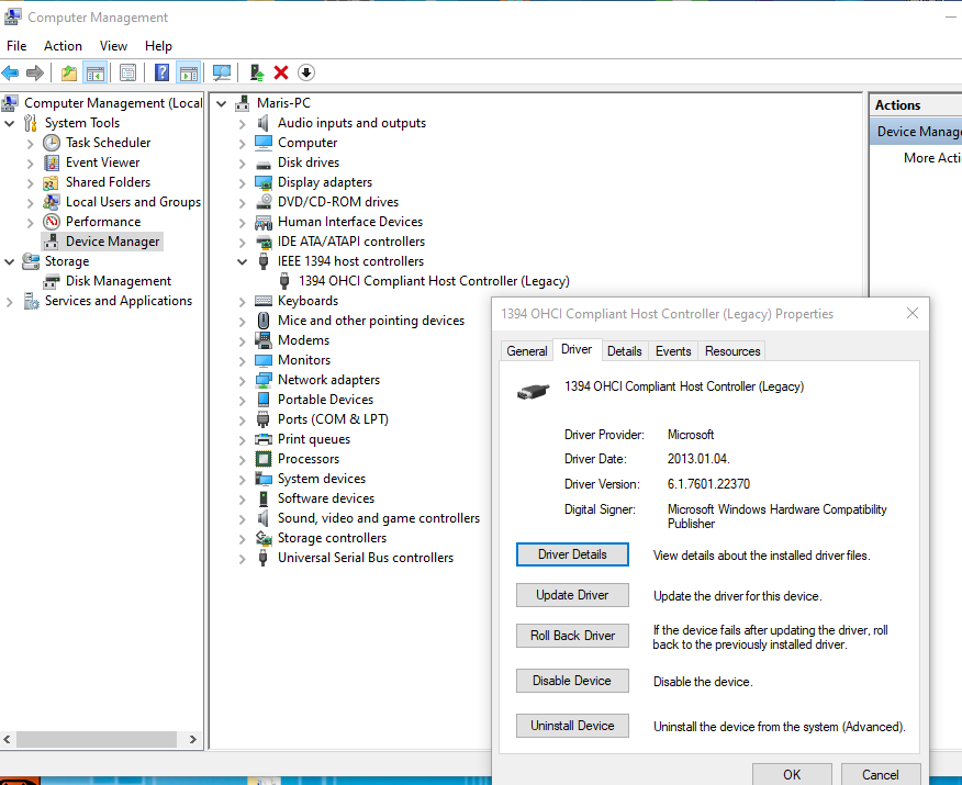 Keeping reply #14 in mind, what do you see (screen grab/image as you have done may assist) when you click on the 'OHCI....controller' in device manager with the driver tab selected ?