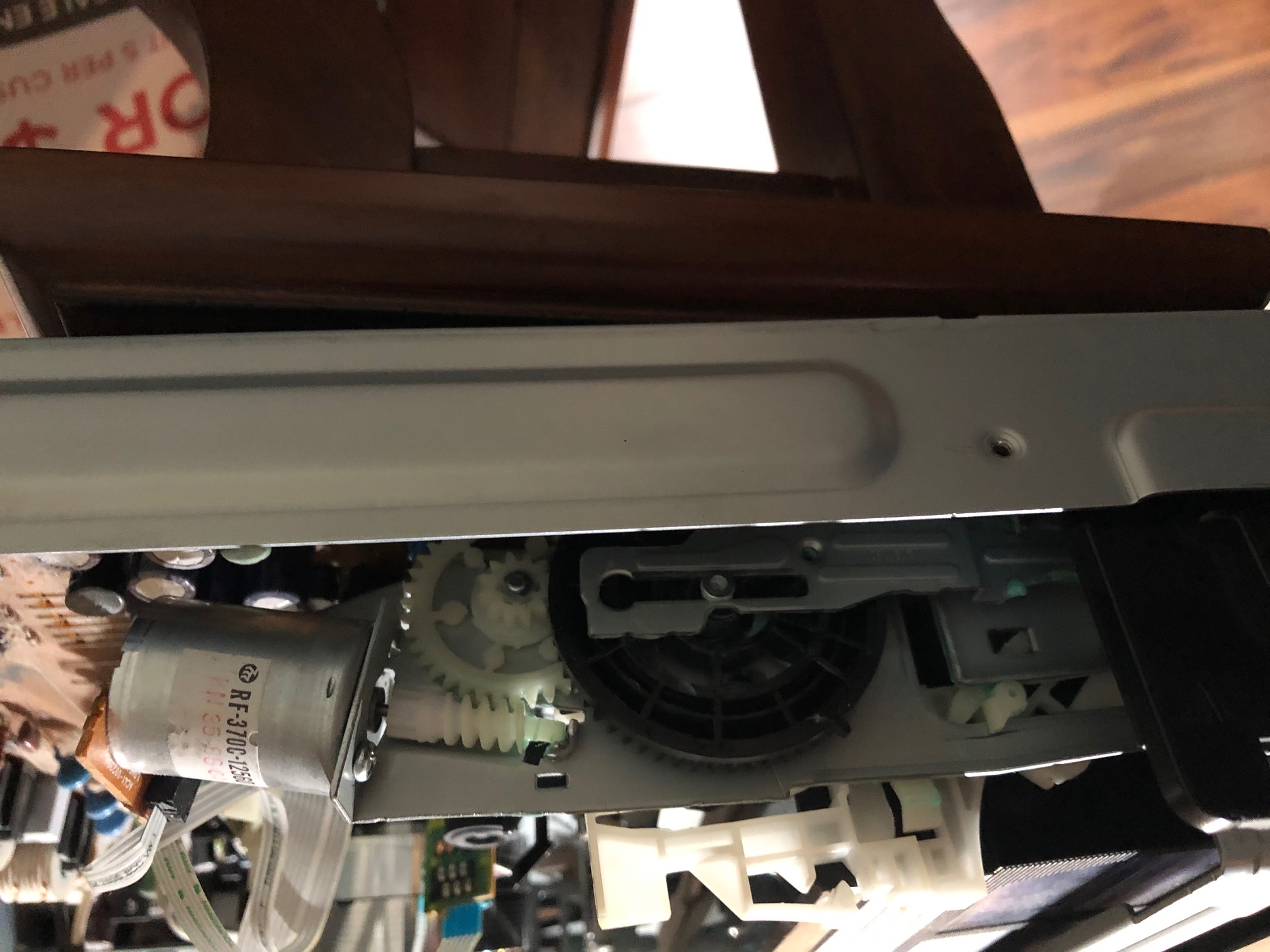 the 1" screw turns a white cog that engages a larger black cog which appears to have something to do with accepting and ejecting the tapes