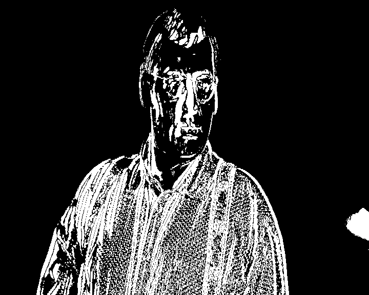 After loading the video with LWlibavVideoSource() it builds a motion map with mt_motion(). In parts of the video that are still the motion map is almost totally black (again, lossy compression may create a few non-black pixels). In parts of the video where there is motion there are many white pixels. Here's the motion map showing the differences between frames 0 and 1: