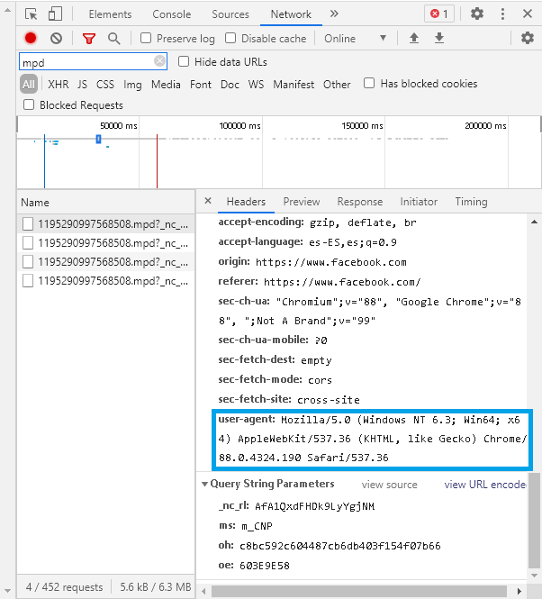 ffmpeg -user_agent "Mozilla/5.0 (Windows NT 6.3; Win64; x64) AppleWebKit/537.36 (KHTML, like Gecko) Chrome/88.0.4324.146 Safari/537.36" -referer "https://www.facebook.com/" -i "mpd link" -c copy FBLive.mp4