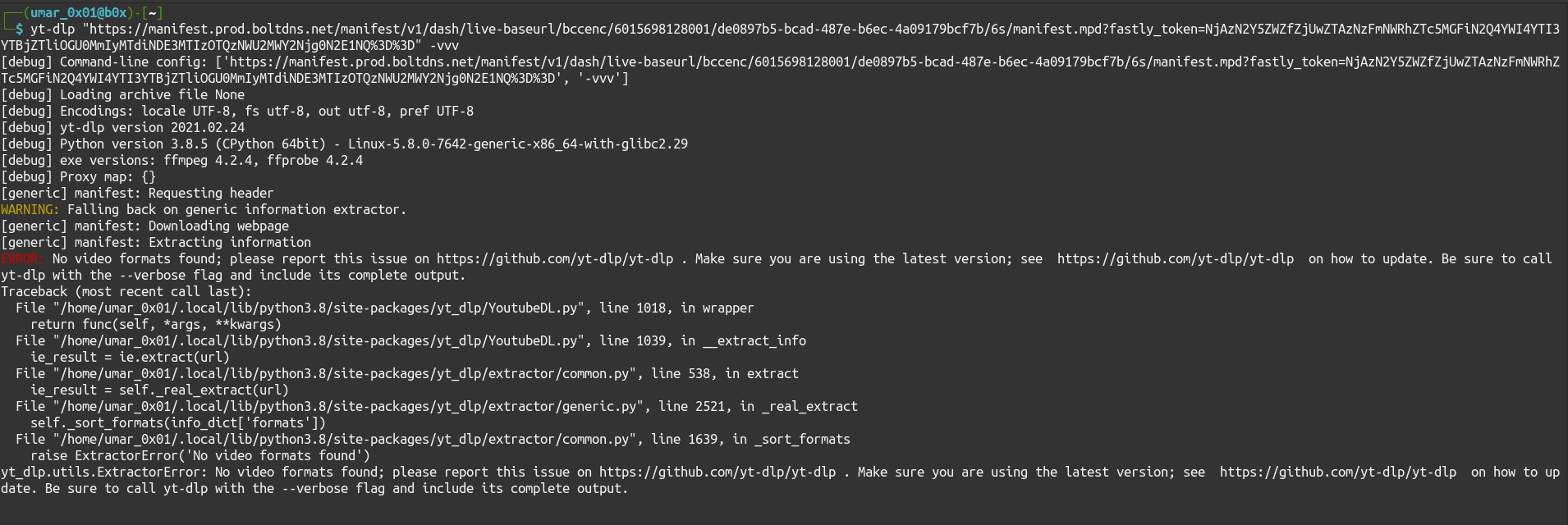 Output:Code:yt-dlp "https://manifest.prod.boltdns.net/manifest/v1/dash/live-baseurl/bccenc/6015698128001/de0897b5-bcad-487e-b6ec-4a09179bcf7b/6s/manifest.mpd?fastly_token=NjAzN2Y5ZWZfZjUwZTAzNzFmNWRhZTc5MGFiN2Q4YWI4YTI3YTBjZTliOGU0MmIyMTdiNDE3MTIzOTQzNWU2MWY2Njg0N2E1NQ%3D%3D" -vvv