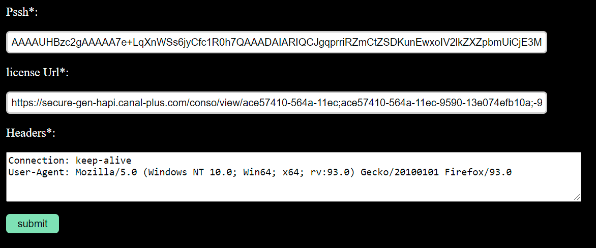 Here is what i put on http://getwvkeys.herokuapp.com :Code:curl 'https://secure-gen-hapi.canal-plus.com/conso/view/d064cbe0-564d-11ec;d064cbe0-564d-11ec-9590-13e074efb10a;-9590-13e074efb10a/licence?drmConfig=mkpl::true' \ -H 'Connection: keep-alive' \ -H 'XX-Request-Id: 1617562986972-2ca2b4e0aeb0-1638765276553-314459' \ -H 'XX-SPYRO-VERSION: 3.0' \ -H 'Accept-Language: fr,fr-FR' \ -H 'Authorization: PASS Token="10901spCURdAAu2SFYuoq5oBP138UCE1-4_EIepU6E6n8j4ClIL9u2RbIPKk9xoSSwKLPJfc443DqhLaaZBVH8-dXGWtseMTkfKGvfDKmji8rIcqSfK6HI8takwc4ofYlmCJ7lY7O40jPT8M9-oomc7dm_ckELLbijGSn9uR7hvOZL4MYRzmnb5X-HZfwHFv4wMkzAyqzHmYZORSGGAxMGQbTU_TM3tGxm0ZL8CpSFwqtHTKsZn4o6lKpE7Id7hn8oLhxz3f6wDZgNvTlp7AHpHfmSR2iJI974vnBjsCfL3ceMnp8CxYvMFxAvxAEEGPp93tZjWgNe6LURLilhk9qk3T4cl-9Fa8MwmiApCH3M2eebptrSyjVfcdhJHvk7vN2FcBOrRQtk-rRx0pIDdBRB6OIbvTFJytDNxc55uD_Jg_RU5gYx1NjZw0HBqIzfLQ75CIqMJ5ZakfpIsA3rk5pjcdfS_9oPJ29VSDRz66mYkBInqXxfa82zh_ashA92W9tMAhQawyuVatCTibycp7Sr3MsD-ZjsShhfB41cSLLZhdD2a5LEXSEC8SAxeNOQGopgyJvyuSiM2ZG9MZ4z6q_pjSER5eR-IjH1Lmkw3-SPiYYhCMXxpOQxViDKP2F7hRxzEUDtORNXxWg0q2ltndqgGqVmPEyNSeA7fiNkqKnwz5IcSNu2DpJnc4EtVYtqhwf1JumrWFCnYHiYTdY7H4QardDmQUTz45qHNlQAIX4krDwq0HLLIT06nahzi7s0A4Ikvv7dkwgXnUxomzmFCOEyLGvo96UQt1odUOZj5xPB1y4SzBFlTqs9Dad0OL98enMHQTUIty9Ar2ne5Id75j4_b11FPYmlMUYMkMu3vm9DscPV2yWOY5yo-zFDd-KmGbAnjMWbfz8RniyfIWu-yB50NnViepcd6vtEY-UbVy51oQmgXH-3j5uRK1vp6kk3RN-_MUoyXa64KAsIyN-YVUvPFDvIuBkoASPGL-dSYueKKVPfqolcOfuugemZlkLIsZ1u3fx3-pcmBLP5iSVQCrZX6sKVYs1e9nZHIBxgmLHfOBkV_lqNLsxaoprYEts2E4iHqgFWka6KlzcnkuokGSIYgJz7Ni_QQ9uTN5t85Ct8QCFQrKGIEEGTIaM6VqB81eTS8-vcmvRp_BwThPyjGw3OX4Gll1b833-HtbcYBXIrrFR0ww2Eda-DPcvlLjsThHVxOiO6jRTh3KCjGl2NQMklmuVNoMA4s4mUFQd9WsA5n2RBKt-vqV2UYBR1ObPzOHpqtslRzmIobsXKpo7iPQwxjWqfNvXBzoBmszgFCiZiRIQW9SuUVgBwcDtnYsBCo3UL0BdTuruZnhK678N6EOYb3GrIQZfx3Xqjz71AvbcCO8m9R0nEQnpG7TlXhPZDbE8BjKHBqSoxN3ewAxvp50WdrGutaA_06ynoqVOraNkcEAV5Dj155vw04Crii9CBoJ77qSs"' \ -H 'XX-Profile-Id: 0' \ -H 'XX-OPERATOR: pc' \ -H 'XX-API-VERSION: 3.0' \ -H 'sec-ch-ua-platform: "Windows"' \ -H 'XX-DEVICE: pc 1617562986972-2ca2b4e0aeb0' \ -H 'XX-SERVICE: mycanal' \ -H 'XX-OZ: cpfra' \ -H 'sec-ch-ua-mobile: ?0' \ -H 'User-Agent: Mozilla/5.0 (Windows NT 10.0; Win64; x64) AppleWebKit/537.36 (KHTML, like Gecko) Chrome/94.0.4606.54 Safari/537.36' \ -H 'Content-Type: text/plain' \ -H 'Accept: application/json, text/plain, */*' \ -H 'XX-DISTMODES: catchup,live,svod,tvod,posttvod' \ -H 'XX-DOMAIN: cpfra' \ -H 'sec-ch-ua: "Chromium";v="94", "Google Chrome";v="94", ";Not A Brand";v="99"' \ -H 'Origin: https://www.canalplus.com' \ -H 'Sec-Fetch-Site: cross-site' \ -H 'Sec-Fetch-Mode: cors' \ -H 'Sec-Fetch-Dest: empty' \ -H 'Referer: https://www.canalplus.com/' \ --data-raw 'CAES3B8SSApGCjAIARIQCJgqprriRZmCtZSDKunEwxoIV2lkZXZpbmUiCjE3MTA5OTU1NjhI49yVmwYQARoQEE7rl3KL10TmuiDwAv9H/BgBINylto0GMBU4uPfgGkKAHwoUbGljZW5zZS53aWRldmluZS5jb20SEBcFuRfMEgSGiwYzOi93KowawBymFtN3/JiRb7HQvsi74U38SovY5lySZJd3SPreP2mpoW1iOb4SeVNbO+UCtT4T1zkDNh5A34j96776Ms9waAHmL+GuJMDCEkZ7dlOsn/PkBTrEcyD9V0NJMqfZ+L0UmuBwXfEDFHF/GVDwxEqAlm0QRhwKqwL4mDUDpQSZVXw3zuq+ZEbMHD9pK8UlrhrvuLRaq7ToL4Xo1MCsf5gpGYAxMjWv3CbMS3C9Y8OcSrfYHMvaAGrN7hzOSbcKUsYIA7qG2UHJtFiPDCFZhRkM2fme5U9dT5b+7aCP5Y37pRn97cSUB/BbyskK1YVHwMhXjj2NM9EahrpWwcJCc0RFNnFQxcbQK0VhteApn/IbnHWGlI8P0bbqmDmTBJAFKm+YdRlalgem/zNy4B1/7wvVKZj3fjnPVA0n2OXHnSFivOQk30misykvC+BoMSDsUy/I/0CVpBYMl8aKOybaofdw1fLRYJM0A9mrOCx/KGveDr0Uh6zuqIUvkUkZizw7DxYuG2E19bEvDGsBRZ3TKtO+M8KzDZgINmFILrwXwiu5YpF1d08dtS0hg82P6+7Gc6U+j8gHRSAlELItSr3hXH6VF0RItNx9abXzWcddoW5LmDwzg6zEGTGayaOeqckSAeELwd/7tODJ5HMtya/T30y208Gg1D6ezH2pWQyXZUcOKfGik4cCCjs+7nOsMv3WqSpaBz5QVB1fNvQ7tMOn0B6bwlce7+lFSWsVGE5xxbGbrJkxA1paKRN5Ym02SFffOGBMEz5r0b6LPeizpA5EsnjkTbgKyWp0J6GpD+g029523xdGXgVhxgc5knQ/u0Qh0omzVWsjkGLvgy1BeDLinHF9Ok3OEUL0fQOqPH/y2Eb/R8U58wNWfRMDOrQdC/lu71TeEXf7ihUQZ8REPWTsEP/Wu1f8BADAnXFehNW+H4Yut2hdyIu4eRglQu9HPAd2TqDPfVe7Fs5D0kolE+yvsqjwGF9FwxrDSCXjMRqnzRxGOJlrybExee8lgMtsMi0a/DVyxMV4GN0gZtPVtivmcr6bWgR2fRcEK/w2Q9NYM3rwN1HDKv1eePxktABEXvES4EvDhX3ghH9F2jOvxl/v2CLcvQHdGfIH0SYr2xgFFSeKTAKXFdy+bRMyVQH56wreInSAMUR4VhwBbtrVPgKKD1UnSf1TFUeDiOB7zpT8G45rGMMIP2qoF+0YjKQLz95fDnF5GLmSRpAvLmuivb4aL84gkCAPb7z3UKvl7jO9fkQtFUEiwNu6yVgB+VId+biQbul3+YZQVW/UkOFghKo2bbDX9W0BW8GhgpJ076tr7yc++Ev/rr2vLoc1B/bynII1DMEuJfW0TSlqS66D4cyvTfirBwvvbVI66HojM9gyGUzs39Up6HjeIK0NSHzqvoKG+uSpZRYhD9n8BpBGdgAZQ9eNmudA6CggqTKDVatL6BXh22tovmM0b8XKL5t4yYaURakA2uSoM5CK4IeYoDLEC1AKK0db59U1bz4WrBCwGQzReopmyg1FtlWmvC9cSy6n7JFc8Brn6dGHJFRLA1mWdnxoyKTiME6bGt2kROgBuaKkPh/GEE4cYxg0yg9Vw4GWagTb9v53Go3R3QIqmFbC6ACEQfRhSho+bhVTrC4VBku2yiJ022k3bYZREvAk/+otPFhrMJx2TiYnJhPMm6Xqe8xlLaqJcCcRK+ljaZPLxhTH+QLVJ2S1k6UozCne0K0AMOKI6PoTuibdMa3pPvQU21Sb1mq6CyD0DZJHb2/1cZwv9bKlQ0isl9eDFKTlnMywakb1YIK9ouY/8fSZ/CPvG9RzpIe05EkX1KdMO5Xe1kY5+QHSsZLc6QYdH5EVkVKmOU29TMUw4GOp6snscPYiLBYmg7GF6ZKmQm6yhid04VxxGmOxhkeJItFa2crgPOGi60AU4xrn0Mu/EI6rzOWua/D4CxUjfDV7mDlEDaTa0mfV9jXdWbs6Dz+6KnLFewVlgfKAclBNTEOHf4HrGvVA/SOGHnG3JdiJgvdseO6s2PXyxIwhD8LWIUJlw2Ag1Uelzc70ZZEqRq2Igbtpb6spiIeR/HpfXL5Igv5PnFnpMANJL/dHYYb/obJG3Kvmr9qHqjA7dRiTTZclFIV+hsNfCEy3eC+qck0SVou7b8R7pWL4IgOFyTUk+UVXwpai9y6LBWZkIcuEv2Se6wNS7mgCE1tWVWbeC5p6Nni/YYQrWp3AonyfaPOo4R4mXZsmfBI9NK9ZQodHh7ykfb6PWqzLm0meKZZ30bbpaZwm1hRU4y3nYNxemRAg36IydgRH3P2xZxx2Wa3ziQB2rMg7kDKzJPgMVLQC8KKY1FhLuUUiM9OTEkMIyIhJn0La09qNgZ0r4pZtOLAQXs03HuR3AYbwz1KxCKpzofYMCTPCjEJbEMKyJnRaFMTNBJRYuluUDaEz0MdLA2Lk3H/XDyg93+edqFPzw0Hn4kOX2GicxZb/+l+WBY3OgSLMuZ2gBCkGdPZ9xZF/GwZ8xCAttgJwxIpuMTPLWRcQftODOaopuoUWpb0rGDYOYCSnZ1YjNqEszsmrjezhADrFrTirBfx0seUDjU3G7HCQTYeOYDsBHrbksE9xYTTrfgGmDGERFhvxE36kVwaWLxNtgqUkCXNopBLDC1Upa7h9F29YNYy6bdrQtR/G02Njn1zY10/fFn/uh/9LHuhGflaJwJzb3Lnx3t5e0XYzkOK0/5qs8B3lxCKO7p4A6COsSxKxkmlXd8SISoZmol9r2DetnjqujUj5FS53N50BXhLShWaEDYTG1ZNuHGruBNdkb71SiMTwGoK8mZD0B5/Pnb7ApnXbUBbZvp82WwOPhVyfvhF9rE+G+eNigh4n8wVlFqvXiSDZP0q6uVOvE0MqIfMV28OOXy5cI53wrHgjgtXUoZLpG/1tAsfeOWXG7ZkIv4p8kpLQTUd6fmhH9kPRkBswQWqhu0Ehfwd80x/hcyx/QGb6uW0NutW4jTujGPdTqXJnI0FoLyGS9tFiSveIeabh9ri8mHoPRdFyoQeQ/UlkuJZChcfOBwi5GYgSUpVhF9YjiLoHOPxRB4Bl2EOsqdIEZS/EW8JU1h45X4b0ul8oBMHdhZPeWQkD0p53RIEeLN+Xs6X
