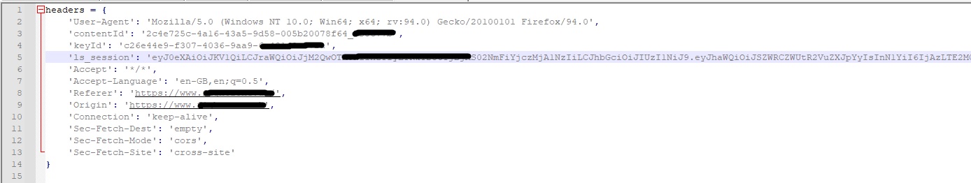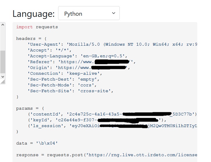 Code:import requests headers = { 'authority': 'mds.ccp.xcal.tv', 'accept': 'application/vnd.xcal.mds.licenseResponse+json; version=1', 'x-moneytrace': 'trace-id=db0fa8c8-c0d7-434e-a564-521d1f938f59;parent-id=6777749836911481023;span-id=9221348891088696998;', 'user-agent': 'Mozilla/5.0 (Windows NT 6.3; Win64; x64) AppleWebKit/537.36 (KHTML, like Gecko) Chrome/96.0.4664.93 Safari/537.36', 'content-type': 'application/vnd.xcal.mds.licenseRequest+json; version=1', 'sec-gpc': '1', 'origin': 'https://www.xfinity.com', 'sec-fetch-site': 'cross-site', 'sec-fetch-mode': 'cors', 'sec-fetch-dest': 'empty', 'referer': 'https://www.xfinity.com/', 'accept-language': 'en-US,en;q=0.9,es-ES;q=0.8,es;q=0.7', } data = { '{"keySystem":"widevine","licenseRequest":"CAESzSgSYApeCkgSJGZhMGMzY2VmLWRmNWQtY2ExNC1iZWJmLWY3ZmQwZjNkMThhMCIgOE1ndlR1aGxuWlc2QjkwX3d1c2FuSTBpakRyQk83OFQQARoQ xdR3fvX7zllcq0E2UcCFhgBIJDsy40GMBU4 cWE0wZC2CcKDGNvbWNhc3QtcHJvZBIQg8aqEInV5XiN4oOgNuZ25RqgJVS17Qtma93pfS EkXzzE hem55EhDmZ4LW2c/dHKNf5yQJ9vdU98k Rikv4XDe8XdoHGVvjParcciVcC85S/kzPbrdlH7s6IpmxYATlsIESLeng74bf2wmrokrBFd3OL8QktPK2q2xOvJvu0nRduFacnp 9uyHEpsGHwgkeuI8yidnUEuWC K/1pK6Ph6vNH/2pWkmxhVyRMjoqSTCNf1/e58xFfYbIBHri0FLVl7/TBK466xKnH5VKhA/VBu3a4KG 9BiOXnl RkE61Sry0QzEuxd0Eu5IVDzGp vDwcs4FAw41 mjP8s1j4EM5vlGMuQbCnNMDsfF8/TXmha/BmWPelPigGdl adGySegXSqIt/FYLVPLxRuOgenQDQIgFEfLtNMApMLoktC/qBPeCQGOtGCW/3TvgHjk8820dVr7X20ucSUKYhKxGK9CzmdOxpujueI6FZV0e1vvoSctdW5QYWKLe66TcSnGFOAzYXkH qcTNZzkocOOJgipiP1yke6ZUTCIA5LnlOSQ9h5e5vgMziG8RJK0E6Nz7zI8OovXqRLJlMQKKqdK4VBq75ihQz5r bTgwzueCxFJyX03pQpf mT477Y1b8E4tW/nhPRdObLpcWgIDDkk5Hivr5g4BCRwpEBIHc1u8kI /xEVz 6phFkRrLJjEuOnrxPMXTJIwlytOn23100qLNhMn7Y0fYa2ze2dg4oJcOtiIuosd00vXW6 Vw JOjZMB82SQivdQKof2nmO3AAmX3zCBghWpXj0JhbUU897wo7axDjJNdUci0oQkyOFmNUmsIahujgnN lELkUeDZ fp9z/1K0B/UI3ggfji5I1CTb rNONqv5so7BjxeKzrkwh7LXtUunex WpdzUWdEEuMjO7gEie3/WPI5EQfHObl4Se3LxgLP52pgGxmrE24x 3abXTcOnpO7b03VbsIq8cNN/9Ls3B3vT8fM5K/YJZZGKqOIRtaOlsYb4ZDkDXd17 TV0KJUUo1rvd5hRNRpGv2VPrgO3Pn9rLpVDp89v rEIdfHKK0DsPn1Bovfffc6Nculf/Czgvh7yOeoslVf4GMU SIurB14M6yJhBS2P4Zs/rKQ0PR3oSMk g4ypbecH9BZTS6YeFU7b7RAId4NIBCHrtf5QTfFU0oPBnrwqBQC4IzuO5ytVUHpuSIam7O1mafonZhQQ02PQCMVOTdUtJM0vGo3bsRRUqdwcQ96gmj20Suzbei3Gbhisdmg0TpaJhGUi rpap6la2DjFwOBPdzSqfYKRHOCtdMCKBns6b mDJnvzLC9RYx00HYIf/h9DWMzkoPGzWwXsSyEG/5tK1SFn2 1OteefjKKAHiWhp5el7uAgiVTZ49LDjDDz7z 10yvi OO9OCn4x5BTNehGUnRqhUAkP/lKWHvfN90DKIIv/ fxQ2XnzWDsdyudAagGzXVDU/0OR4N2LlKpb0rVDMSHyPSqBymBe8bVPdxbEm5KvEiCxzraOH7axiYTGVpkufSJgyNhTxw6nwwJGCAtZoMcutEXL3BDj3J2mnnFryP83gyved7VP4gQ wiKAN3kcpwFuWibuVQKhLx2ZmXuPI7I5rEIaDkMNT7bAuTKnUlysu0jLgjCBtNQvyOmfr0UI7E3DxRxk6ZTzB IPypeo3phgMiZzSogXokih955/EQ9l84M7vOoAaHvRvHVx9wEBszcwwZsFkw5KzymygVoVqdUK0nFnIJ04 p/Wkn89i6auG TLm7CGyd4SIv/PhOgtTHgy8o9RN/GUkuIVyIVEmHvh19eINPHwSoaBQFvXpMGZkzVMRqSchs8jfgs3/2OmmMwxkGH6Uae/GK5rwDQ0I1haiSiLfeD3bRTkurQlPj caFiCM89F7MXhn0OZuDFP6aGux8GbBNRgcEs2V42B37kDtPX9gicU2dhF2JIEdWI3 xiXULV3QhL6B5aEFGCoqlG0nACxK5j8LqcPJmB3ydNyFEY8saxQckDa0HIfVPBlMP3ne30CNJQOQTrXwDalcl8rP332mho1FuMYtreFi/IYwsGv9BUKN6GCf7LU4yR1R1b2CA/yEEAn1USva4l5AtpckiCtMkat3z2jUJcL2g2KJhdDld/Mjwg8j7a/kQo9BowOiLxWt RiZVuD8pCgvIwh72yTzP iMqanE660rHblwLejJj9LBJ3SDuejcoANc/1yOJhw76UJOQPrz8zoB 4eC0I7x6qqlA5roujlnlPQ6Wba9 XmtNUfLKw98Alb/xsudl9rhvg1Xg/vqnktZiGOvSKW7CyLTKmTZCrhgU04YR0vbqoTxopQJ6tcZhCl7xhzxPHX1qk9C13EIv0HSXoVh7XyWe1wu0rThjADNywxY1aOFlBaQbugy6W1BCLNcdONcq0wKlnTapEL/48CaCgw5C7CDLOAa9 jF5NfKUh6ELMwteRxgNmfbqUivzhHWPNSzuNcjbPgh6oCByjz5tUR6tAwPrah4pzhppJBg 0BF4lsGy7LhSCxvIaieourzx8ButX9cq6Rr1bADKmliKlPZQKiBdGjAYpctTQZb4hRGgr25oI3kWD7opH8EhXCHrOjOsaxGRl7ALYVJi1Stk z3CA4OycWN7/ywnXhBf5rTUSvmoWDkW9KXE24Q5NHoA2a2uP/SHH7c7cNjYVl3IH9On/5EsQEIj2Riihb4GfTqPZsQmp8CIO4dH3CbVRM7dOk/MDwmBk6xOvWL6gS5b3UovfXUhb13vaw6ZVjQHZ JPCTHYxfCr8Ub/KpfoSb/vpQx4Gj9wZzhWR2A5YhkFlztvnrIjrFKDC7lV dj6Qm9c1TDsVBbiXIsjrTGJC9PR3h00AK7Ijalap7OJYbjaLE3l8AQfruKd2 NiwAF1p83t4n8PzdDducHP80SMg60q QN4efx7JcUw2ZE z/vnhnNJV/1UE8LWoplivyE6Gz1pmuX8ctActfONCjcOVcPKDvKe6tPLAPFXc2hYuSx/UI 75VUXODDsrGfZdszDU59OwjFhvz8DWvNyXxFUtqaTHufDuburw5HiQlbDnreavVF6Bxof02HdKhORZc/h420YdnAju6XOimrSa/Shj3nvQU/LK1mCz/sqaUxUHdGYxuMgT4gZP r0eAR7EuKyc/qOqPdxNS0JZWUB43l2lfkyrv/WPu/ZJYNIBeR/KRfWcKXEagRaBpPYoXqrrQaDoS3RGzUISAlRFvAihFq7pB9sZxGHLT82YCXeKY7vYiEMRKFVdnuyWFGHXaxdBLXbYERl/4o5xdycV0lvC153qWKKIa5/2AaxJntyxtBIcUatEw3CycA0Zvo4wlCRs6Xg0wFXkuCA 9SVWKO1qBouyC06Vs3M9IsA5uV /PsEP DwnNsYtyawvz5eYxS3S6M342boRyzDmqr1blPV /wzVRN2abW sYPuDOPcbhT4AAUA36SxxO7ApemlYjIN2iM8ujPcz6 q6G6n0ShliaSWjErV9YL2W6uDHUAHPkWwlq31uzQb9kk/s q5f4bwC/l62vfTgCtTAWx4vKuPDcSP8rt41U4eTI/XLANPwJ/Q2KMxjOjJCX0NTrGfxqOSUrXf8boMbPTZzUdsaZTnYuIX8T4WQgeGhzLQVTPWG iVFVTR2oc8DP1TyCO78L1aA0SDAdIIDvt581MClYe/LdUB8SbJkhJY6DBKs80Rnix1YPqZ1 2y4wbFdsrbeiXuIn Zlolwi5QE2TE7F21kyFMr8/J8W/Df98j WTXQr8Vexw2jLOQMMp0BnuAGTUhel3Npcsxr68/1xT9u9SDod0F3BLhikMHokiqqC jvD6kHrv8cB/utsa9QFqyaj7aBxVDUJrzm6tUJr//1PvKScasWf8BapacDhSSzdsHnoDhLY43X0mGiSzgNxEwJK6vQt93wZe3jXCF2UcA2SLzKHi4aa0DYyAJKHmqnMnpepj/s9UT fQ58eLf52LaODp2jbEarhnlJaJjSVdILdSQKKkqBc8l7yHCpmXwiWyOL0bHaS9CQvyzaQ/XWASqQo1p5KyTdioD7q o8swsXypMZhauIWIMYNa3WHROInaGnYhCH4GZo/TS23DrLmrbemzT9edDibJ6tf/OmaYpcF7l2WYjYzzzyXZ/NsojXmDB8uWIpCGiCQhYWWLFbbVEsgIcGoAICpjAYCklnluk0Dvih0PuBdyDs/MJSLKFtWs/8KC6KDeFLWLjcSvYAjQF8AEZPPKvFKGCtKmi2pWB6mUbyauaRsdW x92Xn9geYWX5MfvAyE8FdZGPMPmK Mo6ZAuK1I5rfiz6ya37P5SMMw7/8Wd 9 HWQQ3Zja 7ldZfxr2b11XX5nje5DuxpETF0b2IHbX0g8PN1LBDpr9aR2RJyT8zjljCJkaVkn0SHmcnCA4VxDv VIkWZGUelQ0PveK0YFMCDEWyIjMm/MUcUjEZlgqRHnwx4yJwGpZONpeRsjThEV5aZBgrbcBQ7SHv4BKi/aO0jRAct/m2kK VfGgAmyZGz PGwBPp7/ggXNDwLAcBP38oOuNh/0I6lqeSu0/Y4y9ag2hrhyFWkAj46V6gGw6rhp/urLmUkLK8CqQsA55MOSjkzN0 H979h74je9cJWp04X5FCeKU9rfzLpQi01 A5AucNDRVelXTO/jwbCiQqAKGetOMIXAl0Aywih4tsSskGvA2BaW4jxLgN67DZU6xApUgYpF/rDznVt7I0nu7wk1J4uVbDIyMoUnr2CrV7eQUXOaElYqdYetHS9vuXnBM0Df8qaxmVsqTlM BKMXc5 dtI9FpYePtE4VLvRrxGzxM/uGv605B1/h7d/rcDsV6E8TC7MH6fowI7ne2vw 99vxMCfHLQ63zYEvt8F0VN9kdyGlxqERvrtX2jypbLgRGQadNONRdyj4Pu9f7B1 pjmgXSU4QwyUfUCSCf8nE4eDGvW3WvQD9mE94To8zhTKCWbzU/eiXvp8l8deuUGk txfYWP8v/7BqtYTo0olmz9lpUnkXIE/d9Rm4LuRQfpBIO ZbcPebW4InU0L2/MnXlWoFm6f4xg3Yb