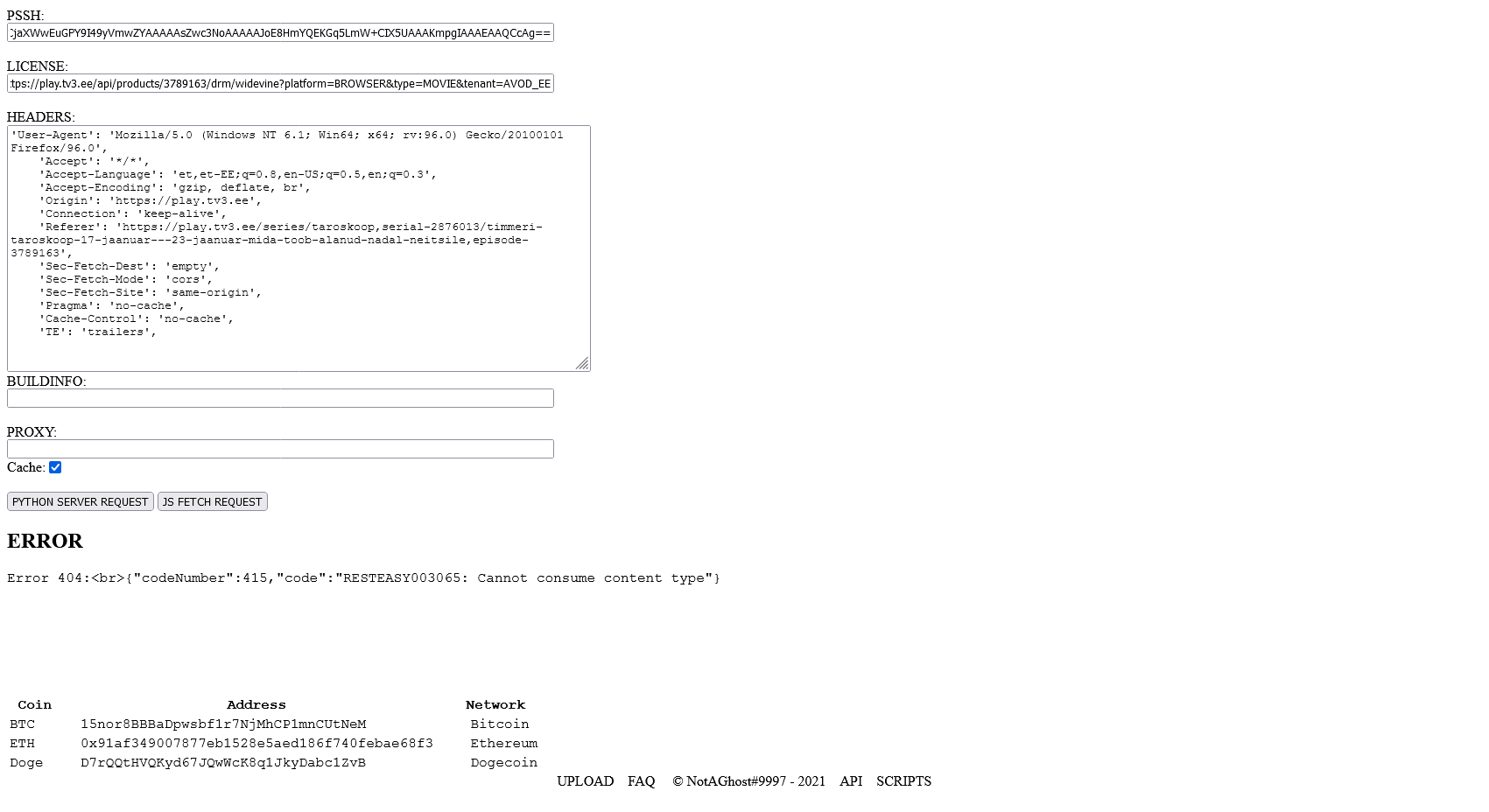 Thanks for any help! This thing means a lot to me.Code:import requests,json api_url = "http://getwvkeys.herokuapp.com/api" license_url = "https://sundance.shift72.com/services/license/widevine/cenc?context=NmM0OTIwZDgtNmVjMS00MmM2LTk4OGEtZTYyYWNlZTQyNzgy&d=os6jm8kj.l4c" pssh = "AAAAO3Bzc2gAAAAA7e+LqXnWSs6jyCfc1R0h7QAAABvnd7V15vX7v3Xb7jvRz5vfbv53rhpr3rhvznk=" headers = { 'sec-ch-ua': '" Not;A Brand";v="99", "Google Chrome";v="97", "Chromium";v="97"', 'sec-ch-ua-mobile': '?0', 'user-agent': 'Mozilla/5.0 (Windows NT 10.0; Win64; x64) AppleWebKit/537.36 (KHTML, like Gecko) Chrome/97.0.4692.71 Safari/537.36', 'sec-ch-ua-platform': '"Windows"', 'accept': '*/*', 'origin': 'https://sundance.shift72.com', 'sec-fetch-site': 'same-origin', 'sec-fetch-mode': 'cors', 'sec-fetch-dest': 'empty', 'referer': 'https://sundance.shift72.com/play/', 'accept-language': 'en-US,en;q=0.9', } r = requests.post(api_url,headers=headers ,json={"license":license_url,"pssh":pssh}).text print(r)