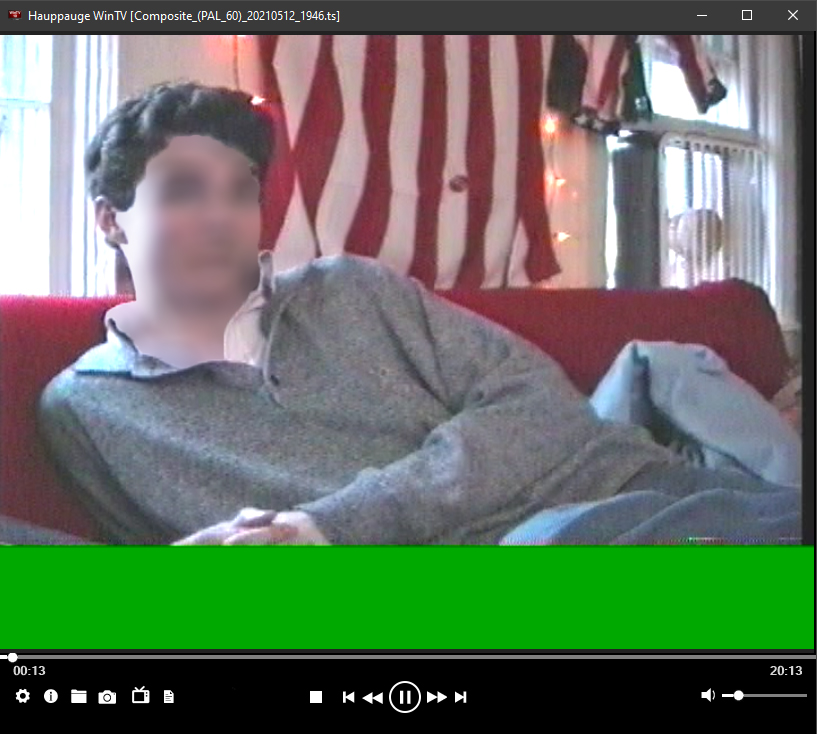 In composite mode, (image below) the tapes play back nicely, but always with the green band at bottom. (In s-video, same green band but playback B&W only. Why? I don't know.)