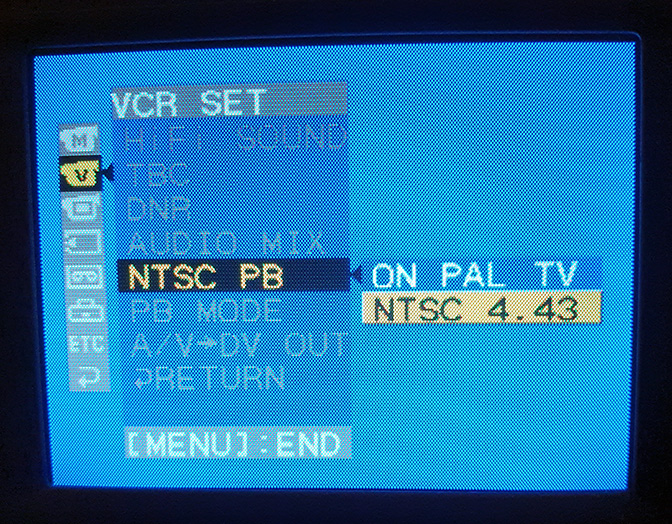 The source is a Sony Video8 NTSC tape played in a Sony PAL camcorder which has an "NTSC PB" setting of either PAL or NTSC 4.43.