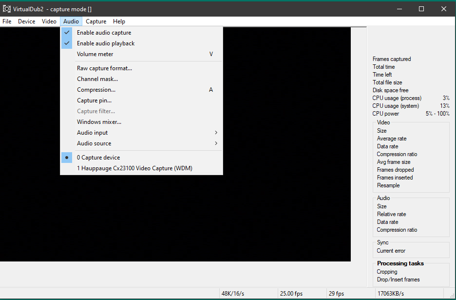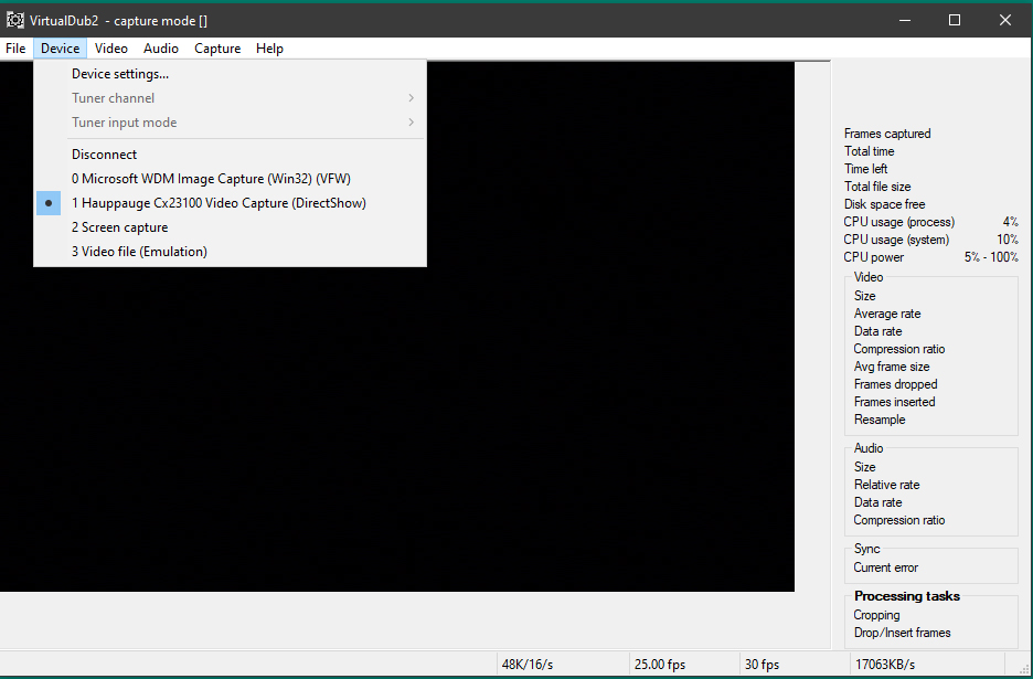 Of course I'd like highest quality capture to keep as a 'master' for then editing and converting later in a delivery format. However, as mentioned, VirtualDub2 doesn't let me set both video and audio devices to "Hauppage", only one or the other. And when I did do a capture using Hauppage as video device and generic "device" for audio, the result was not good. Out of sync sound very quickly (which then turned high pitch, like a cartoon) and freeze/jump video as well.