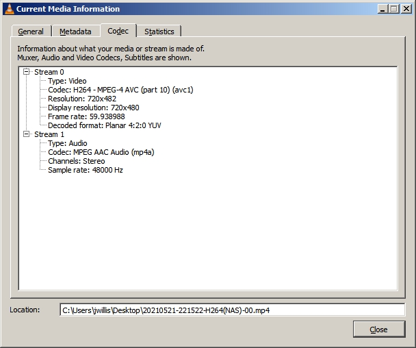 VLC plays back the H.264 or H.265 files without an error, and continuous loop playback works so both the beginnings and ends of the files have no fluffy ragged edges to confuse the player.