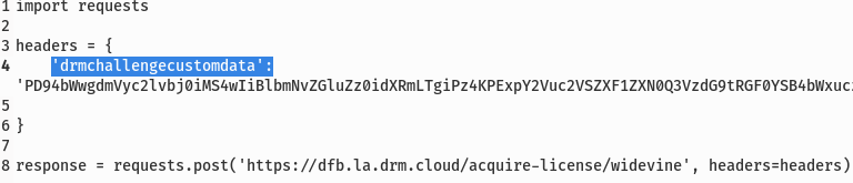 Trying to download the following series from DFB website. I have tried to get the widevine keys, but when I check the license url/headers in the network tab, the request url appears as: https://dfb.la.drm.cloud/acquire-license/widevine